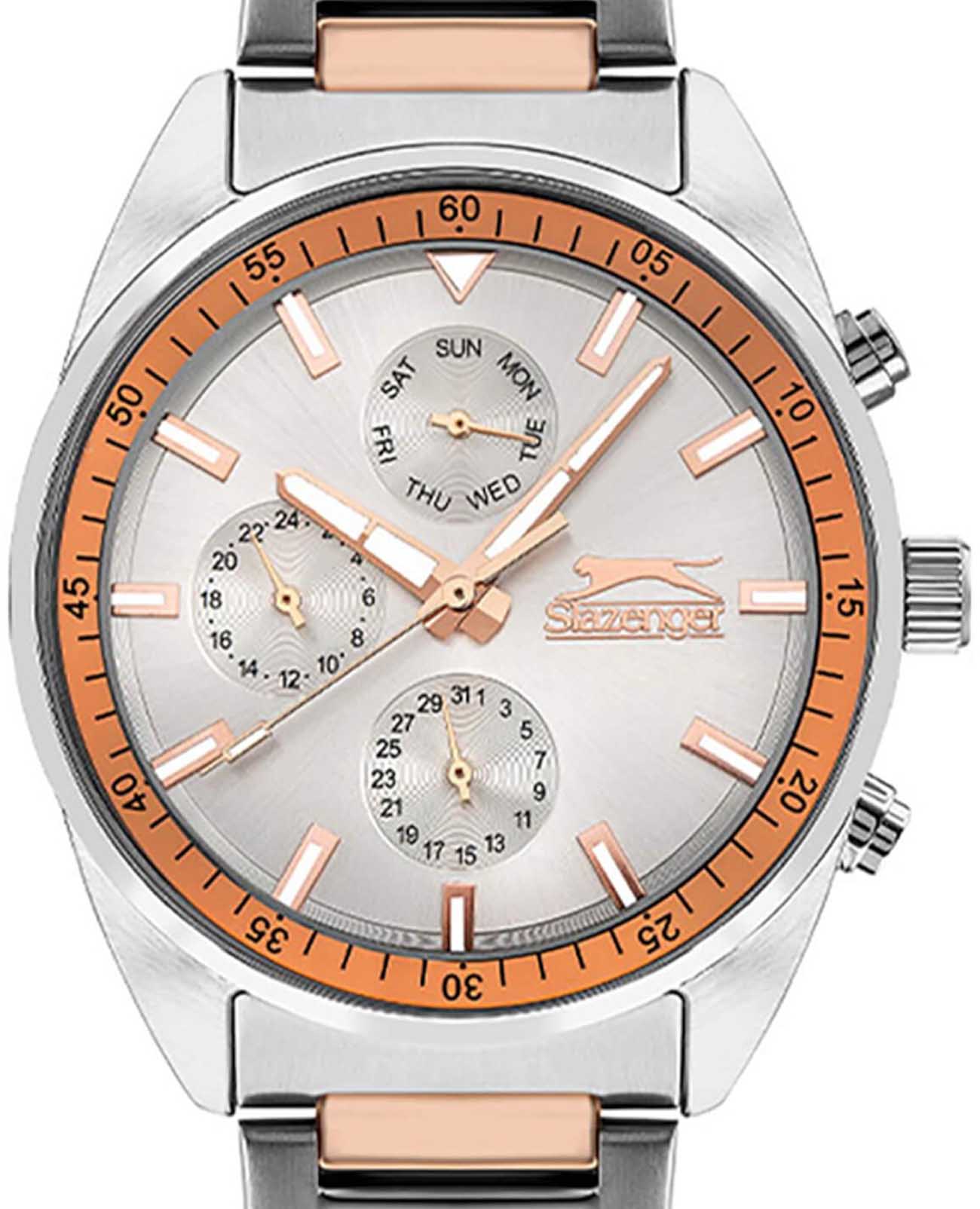 Slazenger SL.09.2040.2.03 — стильные мужские часы, сочетающие элегантный дизайн и функциональность. Корпус выполнен из суперметалла, придающей модели прочность и долговечность. Минеральное стеклоМинеральное стеклоМинеральное стекло представляет собой искусственно выращенный минерал кварца. Такое стекло отличается особой устойчивостью к повреждениям и царапинам. Уступает по некоторым качествам сапфировому стеклу. защищает циферблат от царапин и гарантирует превосходную читаемость. Циферблат с дополнительными индикаторами подчёркивает современный стиль. БезельБезельВнешний ободок, закрепляющий стекло. В спортивных часах так называется поворотное кольцо с делениями на циферблате, выполняет роль таймера – замеряет отрезки времени на шкале. Неподвижный безель – элемент декора. Однонаправленно вращающийся безель на дайверских часах позволяет фиксировать моменты погружения и выныривания на поверхность. с IP-покрытиемIP-покрытиеМетод ионного напыления. Демонстрирует повышенную устойчивость к истиранию, окислению и химическим веществам. Под воздействием высокого давления и температуры около 1500°C молекулы металла надёжно соединяются с частицами корпуса часов.. Браслет из суперметалла с PVD-покрытиемPVDУльтратонкое покрытие наносится в технике вакуумного напыления, сочетает в себе нитрид титана особой прочности со слоем золота или оксида хрома. Несёт в себе декоративную или защитную функцию. обеспечивает комфортное ношение и надёжную фиксацию на запястье. Функциональность дополняется индикацией даты, дня недели и 24-часовым форматом времени, повышая удобство использования. Водонепроницаемость 50 метров делает модель устойчивой к случайным брызгам и влаге, идеально подходя для повседневного ношения.