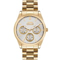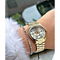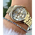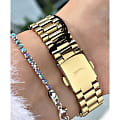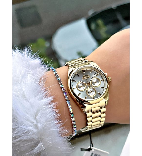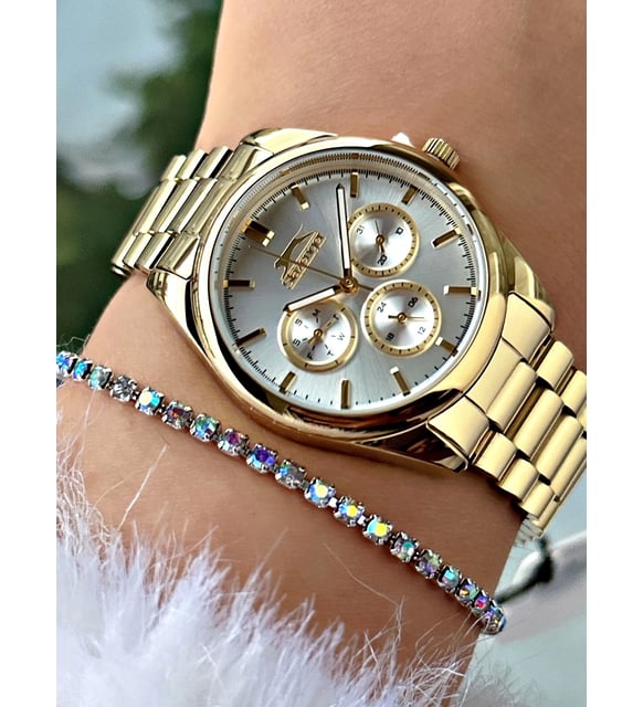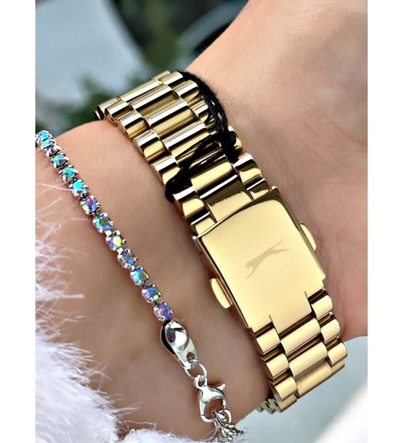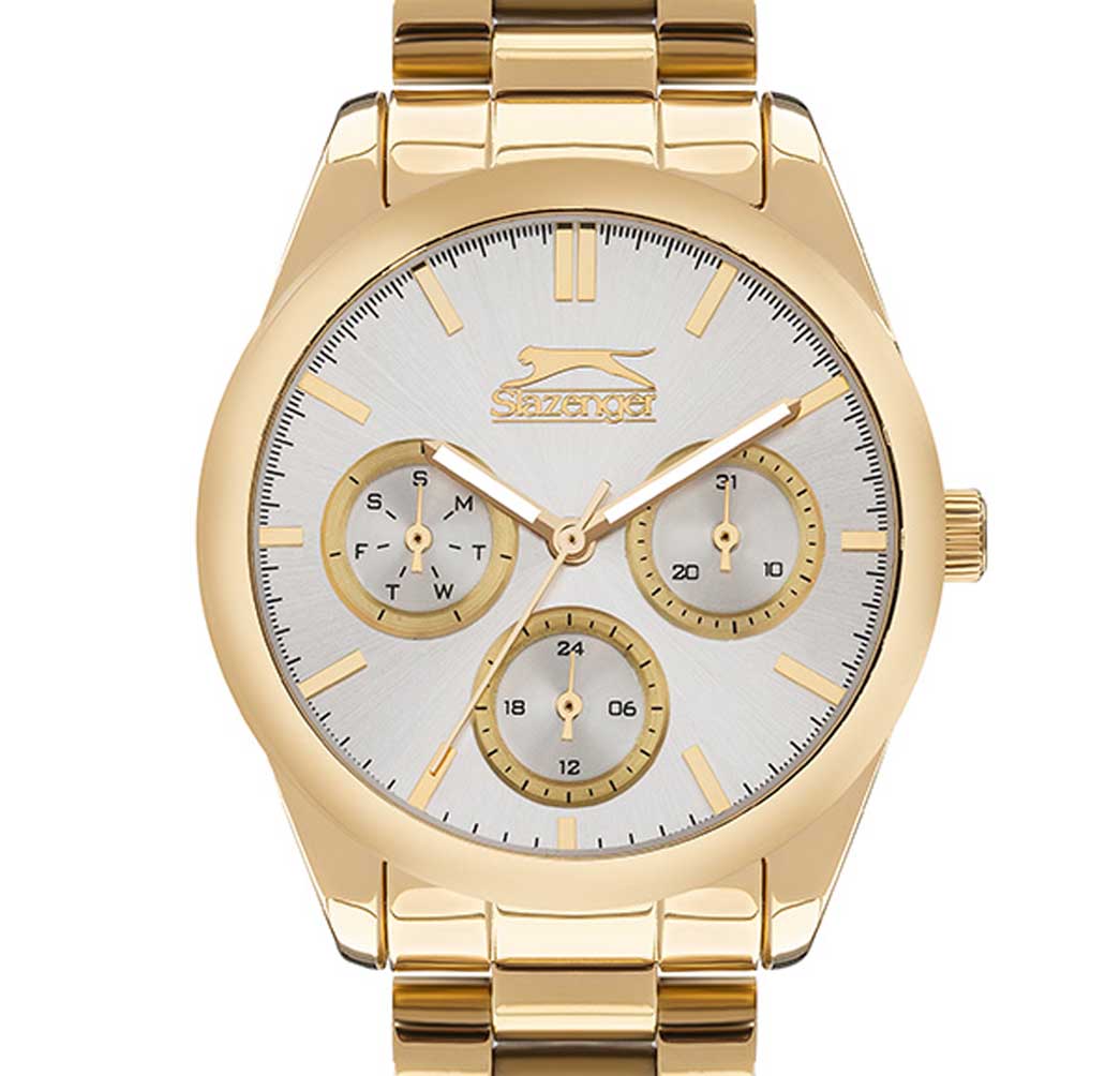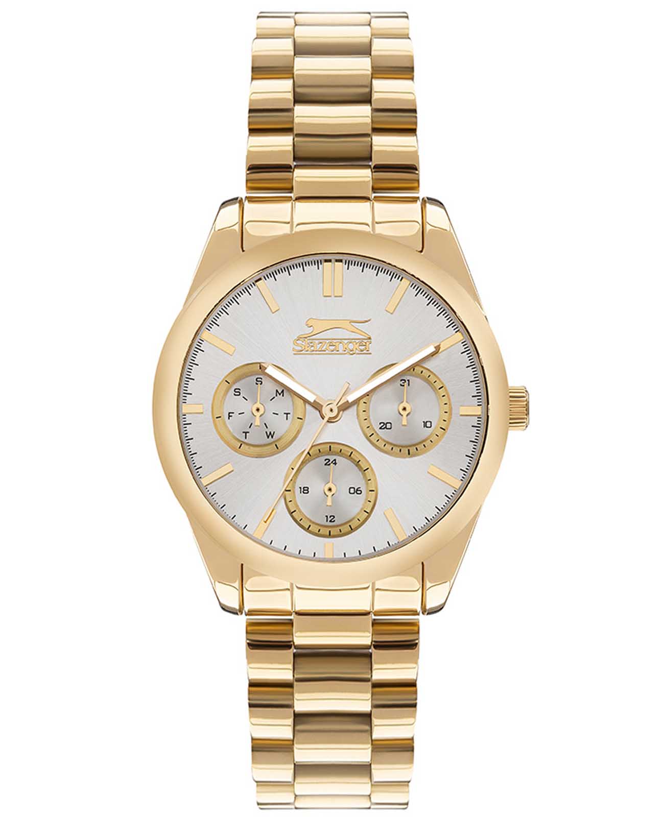 Женские наручные часы Slazenger SL.09.2063.4.03 сочетают в себе классический дизайн и высокое качество исполнения. Модель обладает круглым корпусом диаметром 36 мм, изготовленным из суперметалла с золотистым IP-покрытиемIP-покрытиеМетод ионного напыления. Демонстрирует повышенную устойчивость к истиранию, окислению и химическим веществам. Под воздействием высокого давления и температуры около 1500°C молекулы металла надёжно соединяются с частицами корпуса часов. покрытием, что обеспечивает устойчивость к внешним воздействиям. Браслет выполнен из суперметалла с IP-покрытиемIP-покрытиеМетод ионного напыления. Демонстрирует повышенную устойчивость к истиранию, окислению и химическим веществам. Под воздействием высокого давления и температуры около 1500°C молекулы металла надёжно соединяются с частицами корпуса часов. на раскладной застёжкеРаскладная застёжкаТакой тип застёжки используется только на браслетах из металла. Она никогда не раскрывается полностью, происходит разделение на 2 и более частей. Раскладывающая застёжка снизит вероятность потери часов к минимуму.. Белый циферблат украшен логотипом бренда и метками времени. Имеются дополнительные малые циферблаты для отображения даты, дня недели и текущего времени в 24-часовом формате. Для защиты используется минеральное стеклоМинеральное стеклоМинеральное стекло представляет собой искусственно выращенный минерал кварца. Такое стекло отличается особой устойчивостью к повреждениям и царапинам. Уступает по некоторым качествам сапфировому стеклу., обеспечивающее прочную защиту от царапин. Стрелки и метки имеют люминесцентное покрытиеЛюминесцентное покрытиеПозволяет считывать показания времени в темноте. Производители наносят на стрелки, часовые индексы, безель или поверхность циферблата светонакопительный состав, дающий холодное свечение., что позволяет легко читать время в темноте. Часы работают на японском кварцевом механизме, который обеспечивает точность хода без необходимости подзаводки. Водонепроницаемость часов составляет 3 атмосферы (WR30), что позволяет защитить корпус от случайных брызг или капель дождя.