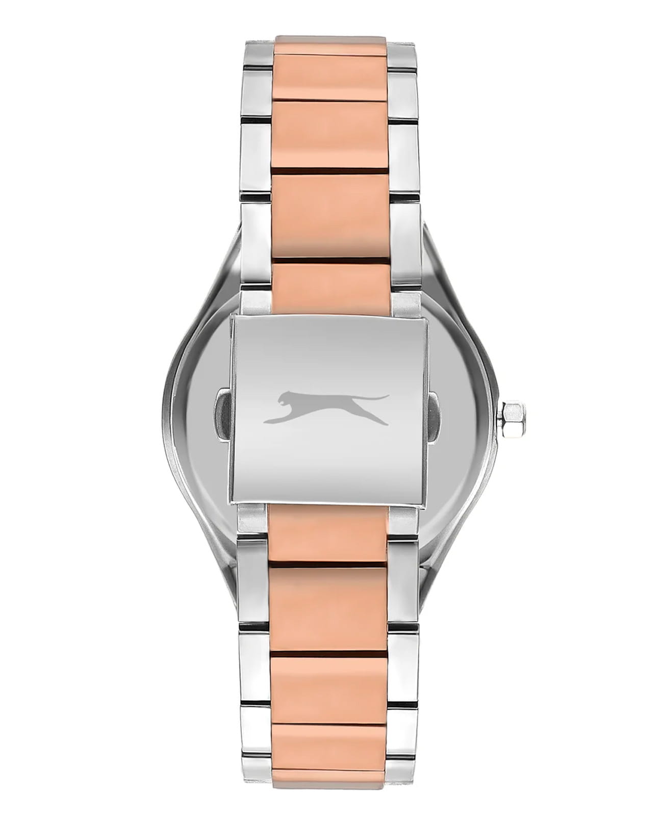 Женские наручные часы Slazenger SL.09.2075.3.05 сочетают в себе элегантный дизайн и практичность современных технологий. Модель обладает круглым корпусом диаметром 34 мм, изготовленным из суперметалла, что обеспечивает высокую устойчивость к внешним воздействиям. Браслет выполнен из того же материала с частичным IP-покрытиемIP-покрытиеМетод ионного напыления. Демонстрирует повышенную устойчивость к истиранию, окислению и химическим веществам. Под воздействием высокого давления и температуры около 1500°C молекулы металла надёжно соединяются с частицами корпуса часов. на раскладном замкеРаскладной замокДанный вариант застежки используется только на часах с металлическим браслетом. Отличительная особенность такого крепления в том, что длина браслета становится универсальной и вы можете самостоятельно отрегулировать нужный вам размер – застежка просто двигается по браслету часов., гарантирующем комфортное ношение и безопасность. Для защиты используется минеральное стеклоМинеральное стеклоМинеральное стекло представляет собой искусственно выращенный минерал кварца. Такое стекло отличается особой устойчивостью к повреждениям и царапинам. Уступает по некоторым качествам сапфировому стеклу., обеспечивающее прочную защиту от царапин. Часы работают на кварцевом механизме, что гарантирует точное время без необходимости подзаводки. Водонепроницаемость достигает 3 атмосфер (WR30), что позволяет использовать их при контакте с брызгами воды, однако не рекомендуется для плавания или дайвинга.
