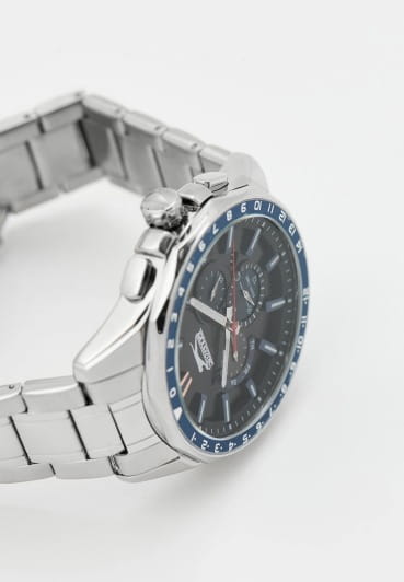 Эксклюзивные мужские наручные часы Slazenger SL.09.2112.2.02 - воплощение стиля и инноваций. Корпус из суперпрочного металла с элегантным круглым дизайном и фирменным логотипом. Многофункциональный черный циферблат  с метками в виде штрихов выполнен по технологии Sunray (солнечные лучи) и украшен логотипом бренда. Часы оснащены двойным форматом времени (12 и 24 часа), вторым часовым поясом и удобным окошком даты. Отдельные циферблаты предоставляют расширенную информацию. Неподвижный безельБезельВнешний ободок, закрепляющий стекло. В спортивных часах так называется поворотное кольцо с делениями на циферблате, выполняет роль таймера – замеряет отрезки времени на шкале. Неподвижный безель – элемент декора. Однонаправленно вращающийся безель на дайверских часах позволяет фиксировать моменты погружения и выныривания на поверхность. из суперметалла с синим IP-покрытиемIP-покрытиеМетод ионного напыления. Демонстрирует повышенную устойчивость к истиранию, окислению и химическим веществам. Под воздействием высокого давления и температуры около 1500°C молекулы металла надёжно соединяются с частицами корпуса часов.. Рифленая заводная головка с защитой и надежный браслет с раскладной застёжкойРаскладная застёжкаТакой тип застёжки используется только на браслетах из металла. Она никогда не раскрывается полностью, происходит разделение на 2 и более частей. Раскладывающая застёжка снизит вероятность потери часов к минимуму. дополняют дизайн.  Люминесцентное покрытиеЛюминесцентное покрытиеПозволяет считывать показания времени в темноте. Производители наносят на стрелки, часовые индексы, безель или поверхность циферблата светонакопительный состав, дающий холодное свечение. на стрелках и метках обеспечивает отличную видимость в темноте. Минеральное стеклоМинеральное стеклоМинеральное стекло представляет собой искусственно выращенный минерал кварца. Такое стекло отличается особой устойчивостью к повреждениям и царапинам. Уступает по некоторым качествам сапфировому стеклу. защищает циферблат от внешних воздействий. Эти часы - идеальный выбор для ценителей качества и индивидуальности, подчеркивающий статус и безупречный вкус владельца.