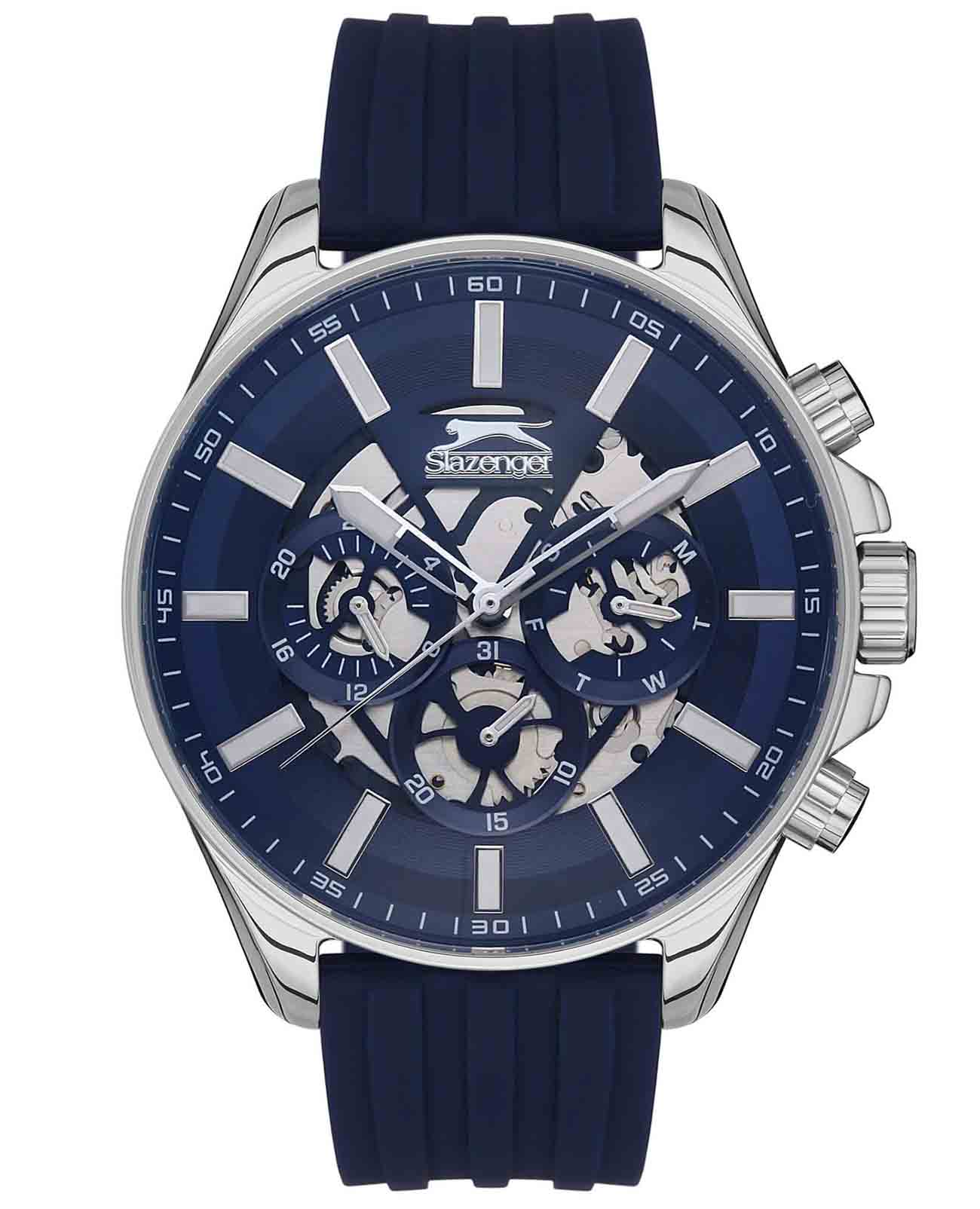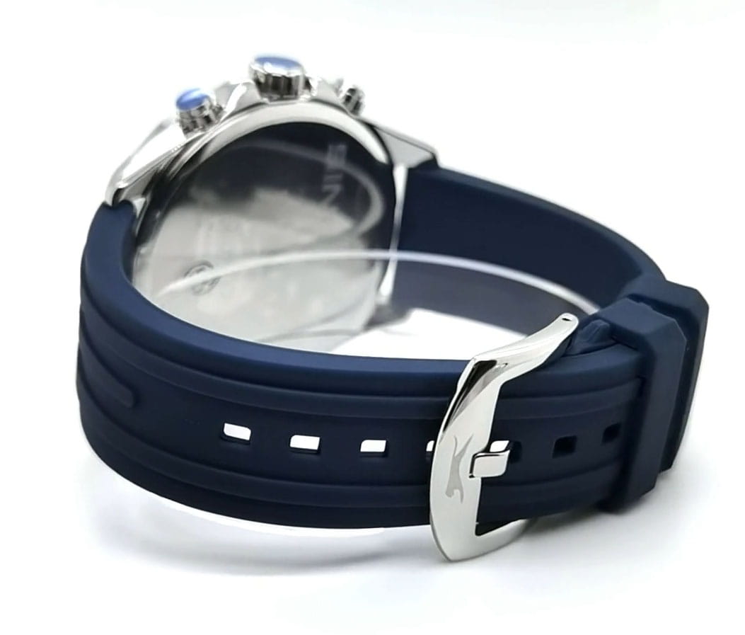 Часы Slazenger SL.09.2127.2.02 воплощают в себе элегантность и практичность, идеально подходящие для современных мужчин. Их синий циферблат, защищенный минеральным стекломМинеральное стеклоМинеральное стекло представляет собой искусственно выращенный минерал кварца. Такое стекло отличается особой устойчивостью к повреждениям и царапинам. Уступает по некоторым качествам сапфировому стеклу., заключен в серебристый корпус диаметром 47 мм, который изготовлен из прочного суперметалла. Надежный кварцевый механизм обеспечивает точность, а водозащита 5 ATM делает их устойчивыми к воздействию воды. Силиконовый браслет с классической застежкой - очень комфортно сидит на запястье. Часы оснащены 24-часовым указателем времени, а также функциями отображения даты и дня недели на дополнительных малых циферблатах. Люминесцентное покрытиеЛюминесцентное покрытиеПозволяет считывать показания времени в темноте. Производители наносят на стрелки, часовые индексы, безель или поверхность циферблата светонакопительный состав, дающий холодное свечение. на стрелках и метках обеспечивает отличную видимость в темноте.