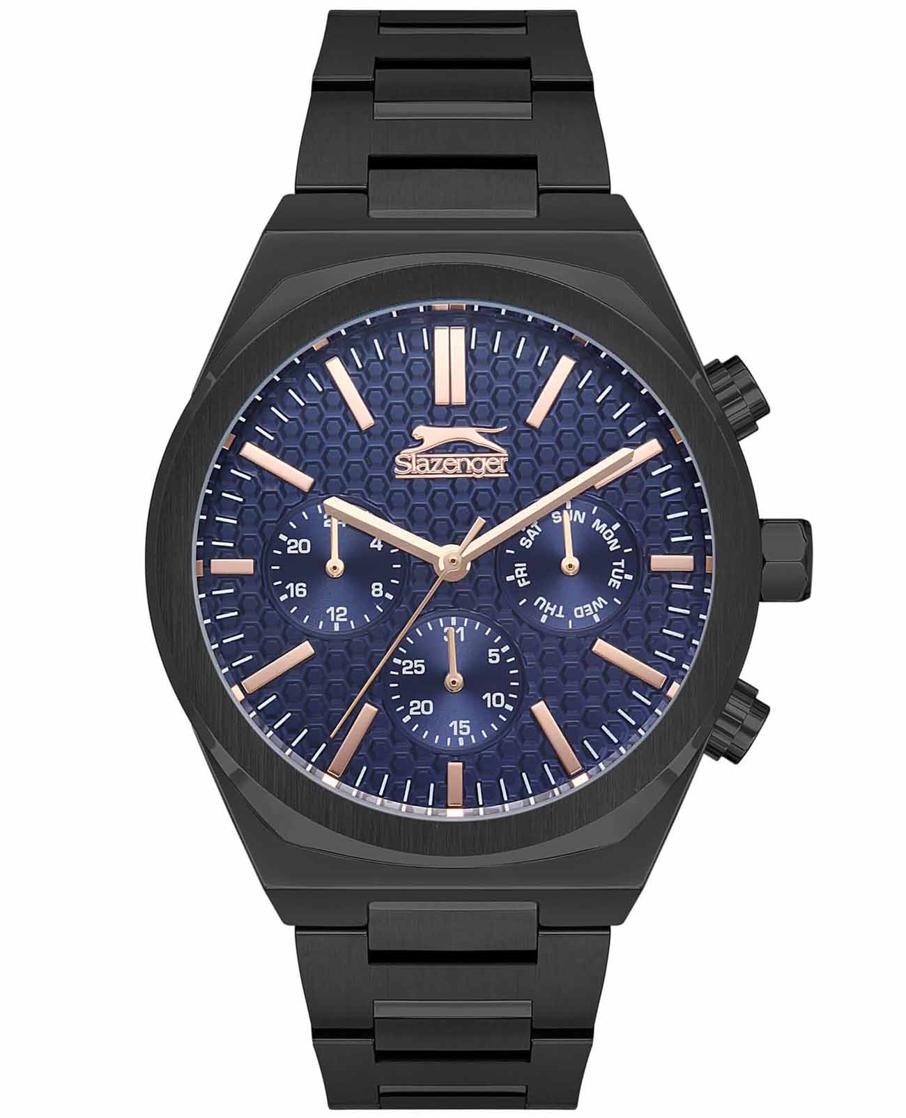 Часы Slazenger SL.09.2137.2.03 воплощают в себе элегантность и практичность, идеально подходящие для современных мужчин. Их синий циферблат с оригинальным рисунком в виде сот, защищен минеральным стекломМинеральное стеклоМинеральное стекло представляет собой искусственно выращенный минерал кварца. Такое стекло отличается особой устойчивостью к повреждениям и царапинам. Уступает по некоторым качествам сапфировому стеклу. и заключен в черный матовый корпус диаметром 44 мм из прочного суперметалла с IP-покрытиемIP-покрытиеМетод ионного напыления. Демонстрирует повышенную устойчивость к истиранию, окислению и химическим веществам. Под воздействием высокого давления и температуры около 1500°C молекулы металла надёжно соединяются с частицами корпуса часов.. Часы оснащены двойным форматом времени (12 и 24 часа), указателями дней недели и даты на дополнительных малых циферблатах. Надежный кварцевый механизм обеспечивает точность, а водозащита 5 ATM делает их устойчивыми к воздействию воды. Черный браслет из суперметалла с IP-покрытиемIP-покрытиеМетод ионного напыления. Демонстрирует повышенную устойчивость к истиранию, окислению и химическим веществам. Под воздействием высокого давления и температуры около 1500°C молекулы металла надёжно соединяются с частицами корпуса часов. имеет раскладную застёжкуРаскладная застёжкаТакой тип застёжки используется только на браслетах из металла. Она никогда не раскрывается полностью, происходит разделение на 2 и более частей. Раскладывающая застёжка снизит вероятность потери часов к минимуму., что подчеркивает современный стиль и позволяет легко снимать часы. Размер браслета (H1-H2): 24-20 мм.