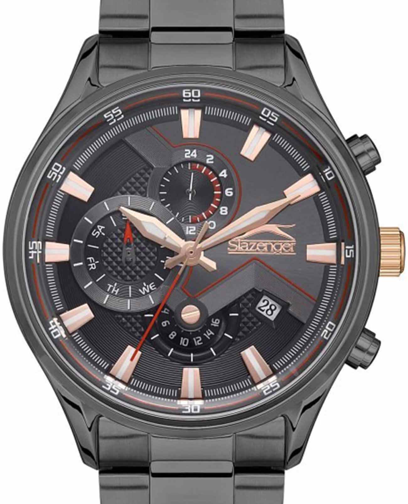 Часы Slazenger SL.09.2146.2.04 – это стильный и функциональный аксессуар для мужчин, сочетающий в себе английскую элегантность и современные технологии. Эти кварцевые часы оснащены металлическим корпусом с черным IP-покрытиемIP-покрытиеМетод ионного напыления. Демонстрирует повышенную устойчивость к истиранию, окислению и химическим веществам. Под воздействием высокого давления и температуры около 1500°C молекулы металла надёжно соединяются с частицами корпуса часов. и прочным минеральным стекломМинеральное стеклоМинеральное стекло представляет собой искусственно выращенный минерал кварца. Такое стекло отличается особой устойчивостью к повреждениям и царапинам. Уступает по некоторым качествам сапфировому стеклу., обеспечивающим надежную защиту механизма. Неподвижный безельБезельВнешний ободок, закрепляющий стекло. В спортивных часах так называется поворотное кольцо с делениями на циферблате, выполняет роль таймера – замеряет отрезки времени на шкале. Неподвижный безель – элемент декора. Однонаправленно вращающийся безель на дайверских часах позволяет фиксировать моменты погружения и выныривания на поверхность. из суперметалла с черным IP-покрытиемIP-покрытиеМетод ионного напыления. Демонстрирует повышенную устойчивость к истиранию, окислению и химическим веществам. Под воздействием высокого давления и температуры около 1500°C молекулы металла надёжно соединяются с частицами корпуса часов.. Черный металлический браслет с черным IP-покрытиемIP-покрытиеМетод ионного напыления. Демонстрирует повышенную устойчивость к истиранию, окислению и химическим веществам. Под воздействием высокого давления и температуры около 1500°C молекулы металла надёжно соединяются с частицами корпуса часов. и с раскладной застёжкойРаскладная застёжкаТакой тип застёжки используется только на браслетах из металла. Она никогда не раскрывается полностью, происходит разделение на 2 и более частей. Раскладывающая застёжка снизит вероятность потери часов к минимуму. обеспечивает комфортное ношение и надежную фиксацию на запястье. Диаметр корпуса составляет 45 мм, а толщина – 12 мм, что делает часы заметными и солидными на руке. Водозащита уровня WR 50 позволяет не беспокоиться о случайных брызгах или дожде. Люминесцентное покрытиеЛюминесцентное покрытиеПозволяет считывать показания времени в темноте. Производители наносят на стрелки, часовые индексы, безель или поверхность циферблата светонакопительный состав, дающий холодное свечение. на стрелках и метках обеспечивает отличную видимость в темноте. Часы также оснащены дополнительными функциями, такими как отображение второго часового пояса, дня недели и текущего времени в 24-часовом формате, а также окошком даты. Вес часов – 150 грамм, что придает им ощущение надежности и прочности. Эти часы станут отличным выбором для тех, кто ценит качество, стиль и функциональность.