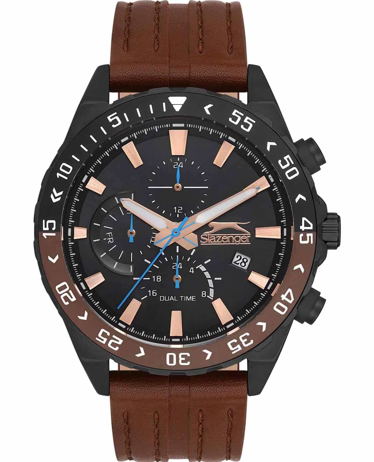 Slazenger SL.09.2152.2.04 – это великолепное сочетание стиля и функциональности, созданное для тех, кто ценит элегантность и надежность. Эти наручные часы работают на кварцевом механизме, обеспечивая точность и долговечность. Корпус выполнен из прочного суперметалла с черным IP-покрытиемIP-покрытиеМетод ионного напыления. Демонстрирует повышенную устойчивость к истиранию, окислению и химическим веществам. Под воздействием высокого давления и температуры около 1500°C молекулы металла надёжно соединяются с частицами корпуса часов., а безельБезельВнешний ободок, закрепляющий стекло. В спортивных часах так называется поворотное кольцо с делениями на циферблате, выполняет роль таймера – замеряет отрезки времени на шкале. Неподвижный безель – элемент декора. Однонаправленно вращающийся безель на дайверских часах позволяет фиксировать моменты погружения и выныривания на поверхность. с черным и коричневым IP-покрытиемIP-покрытиеМетод ионного напыления. Демонстрирует повышенную устойчивость к истиранию, окислению и химическим веществам. Под воздействием высокого давления и температуры около 1500°C молекулы металла надёжно соединяются с частицами корпуса часов., что придает часам современный и утонченный вид. Черный циферблат, оформленный в технике Sunray, украшен логотипом бренда и часовыми метками в виде штрихов, что добавляет аксессуару изысканности. Особенностью данной модели является наличие календаря, отображающего дату и день недели, а также возможность следить за временем во втором часовом поясе. Все это удобно размещено на отдельных циферблатах, что делает использование часов максимально комфортным. Рифленая заводная головка снабжена защитой, что обеспечивает дополнительную надежность. Часы также обладают водозащитой на уровне 50WR, что позволяет им выдерживать воздействие воды в повседневных ситуациях. Минеральное стеклоМинеральное стеклоМинеральное стекло представляет собой искусственно выращенный минерал кварца. Такое стекло отличается особой устойчивостью к повреждениям и царапинам. Уступает по некоторым качествам сапфировому стеклу. защищает циферблат от царапин и повреждений, сохраняя его внешний вид безупречным. Люминесцентное покрытиеЛюминесцентное покрытиеПозволяет считывать показания времени в темноте. Производители наносят на стрелки, часовые индексы, безель или поверхность циферблата светонакопительный состав, дающий холодное свечение. на стрелках обеспечивает отличную видимость в темноте. Завершающим штрихом образа является кожаный ремешок с классической застежкой, который обеспечивает удобную посадку на запястье и добавляет модели роскошный акцент.