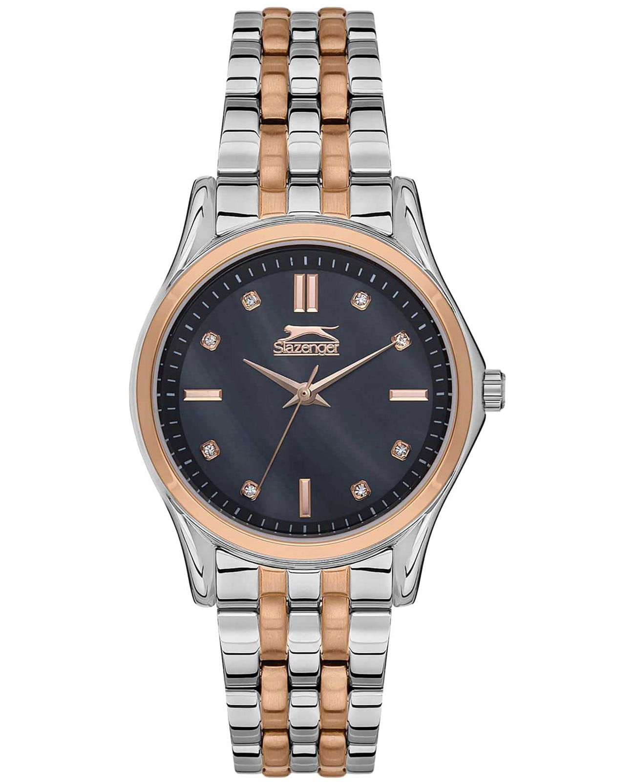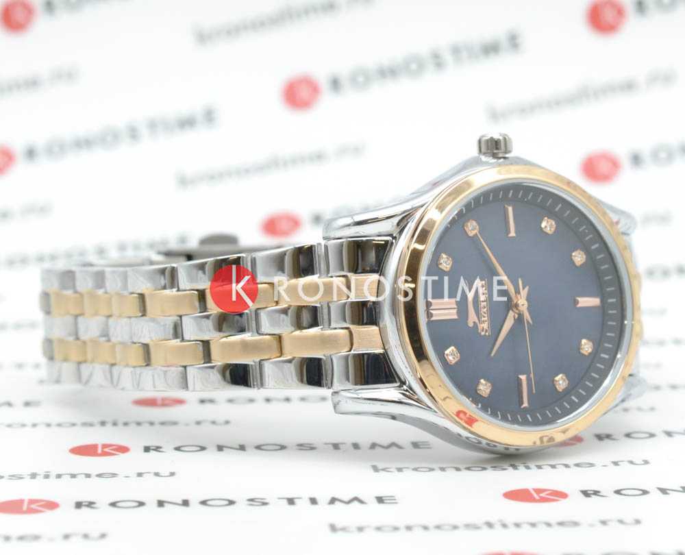 Женские наручные часы Slazenger SL.09.2154.3.02 сочетают в себе классический дизайн и надежность современных технологий. Модель обладает круглым корпусом диаметром 32 мм, изготовленным из суперметалла, что обеспечивает высокую устойчивость к внешним воздействиям. Индексы украшены фианитами. Браслет выполнен из суперметалла с IP-покрытиемIP-покрытиеМетод ионного напыления. Демонстрирует повышенную устойчивость к истиранию, окислению и химическим веществам. Под воздействием высокого давления и температуры около 1500°C молекулы металла надёжно соединяются с частицами корпуса часов. и раскладной застежкойРаскладной замокДанный вариант застежки используется только на часах с металлическим браслетом. Отличительная особенность такого крепления в том, что длина браслета становится универсальной и вы можете самостоятельно отрегулировать нужный вам размер – застежка просто двигается по браслету часов., гарантирующей комфортное ношение и безопасность. Циферблат перламутрового черного цвета декорирован золотистыми стрелками и индексами, которые обеспечивают читаемость времени даже в условиях недостаточной освещенности. Для защиты используется минеральное стеклоМинеральное стеклоМинеральное стекло представляет собой искусственно выращенный минерал кварца. Такое стекло отличается особой устойчивостью к повреждениям и царапинам. Уступает по некоторым качествам сапфировому стеклу., обеспечивающее прочную защиту от царапин. Часы работают на кварцевом механизме, что гарантирует точное время без необходимости подзаводки. Водонепроницаемость часов достигает 3 атмосфер, что позволяет использовать их при мытье рук или хождении под мелким дождем, однако не рекомендуется для плавания или других водных видов спорта. Вес модели составляет 80 грамма.
