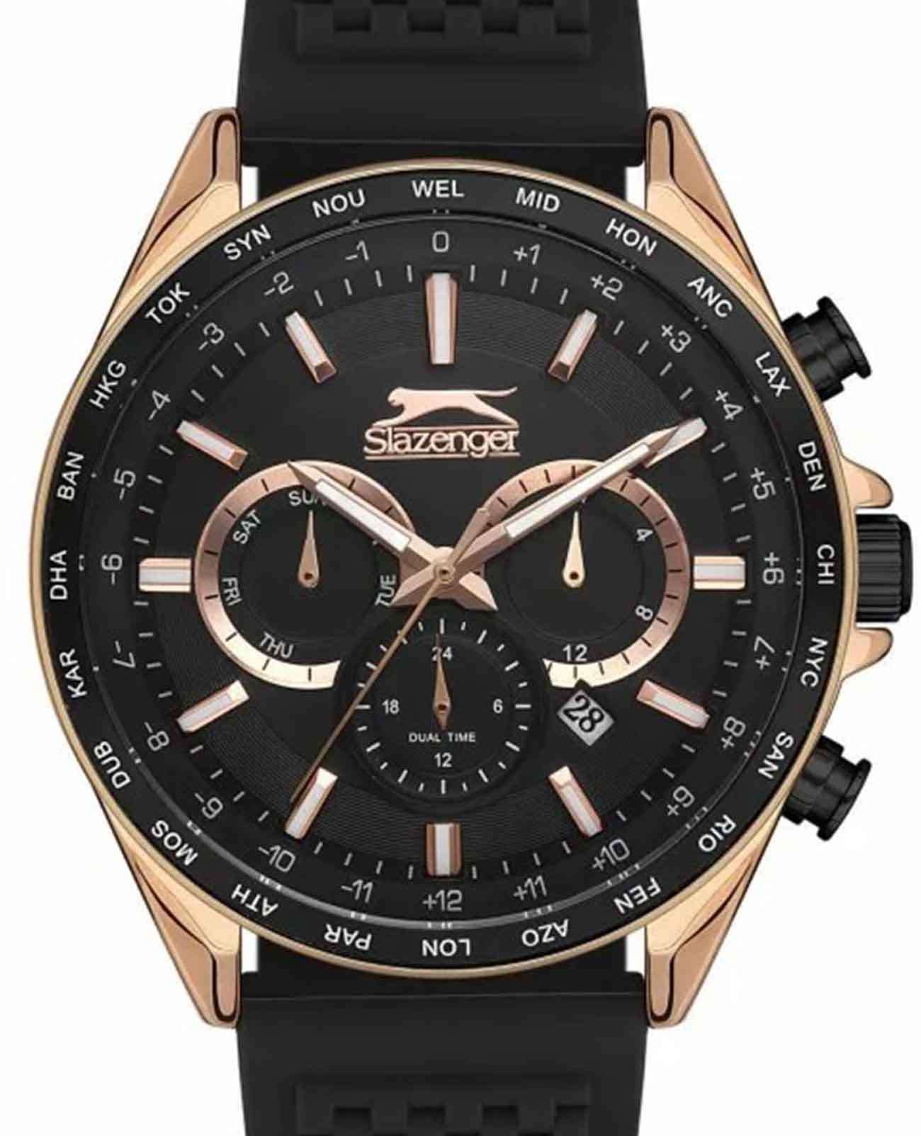 Мужские наручные часы Slazenger SL.09.2179.2.02 — стильный аксессуар с ярко выраженными спортивными чертами, который станет надежным спутником в повседневной жизни. Эти часы оснащены кварцевым механизмом, обеспечивающим высокую точность хода. Металлический корпус с золотистым IP-покрытиемIP-покрытиеМетод ионного напыления. Демонстрирует повышенную устойчивость к истиранию, окислению и химическим веществам. Под воздействием высокого давления и температуры около 1500°C молекулы металла надёжно соединяются с частицами корпуса часов. в сочетании с черным силиконовый ремешком на классической застежке шириной 22 мм создает гармоничный и современный образ. Диаметр корпуса составляет 45 мм, а толщина — 11 мм, что придает часам стильный и выразительный вид.  БезельБезельВнешний ободок, закрепляющий стекло. В спортивных часах так называется поворотное кольцо с делениями на циферблате, выполняет роль таймера – замеряет отрезки времени на шкале. Неподвижный безель – элемент декора. Однонаправленно вращающийся безель на дайверских часах позволяет фиксировать моменты погружения и выныривания на поверхность. с черным IP-покрытиемIP-покрытиеМетод ионного напыления. Демонстрирует повышенную устойчивость к истиранию, окислению и химическим веществам. Под воздействием высокого давления и температуры около 1500°C молекулы металла надёжно соединяются с частицами корпуса часов., что придает ему дополнительную прочность и устойчивость к износу. Минеральное стеклоМинеральное стеклоМинеральное стекло представляет собой искусственно выращенный минерал кварца. Такое стекло отличается особой устойчивостью к повреждениям и царапинам. Уступает по некоторым качествам сапфировому стеклу. защищает циферблат от царапин и внешних воздействий, а водозащита уровня WR 50 позволяет не беспокоиться о случайных контактах с водой, будь то дождь или мытье рук. Особенностью данной модели является наличие календаря, отображающего дату и день недели, а также возможность следить за временем во втором часовом поясе.  Люминесцентное покрытиеЛюминесцентное покрытиеПозволяет считывать показания времени в темноте. Производители наносят на стрелки, часовые индексы, безель или поверхность циферблата светонакопительный состав, дающий холодное свечение. на стрелках и метках обеспечивает отличную видимость в темноте.