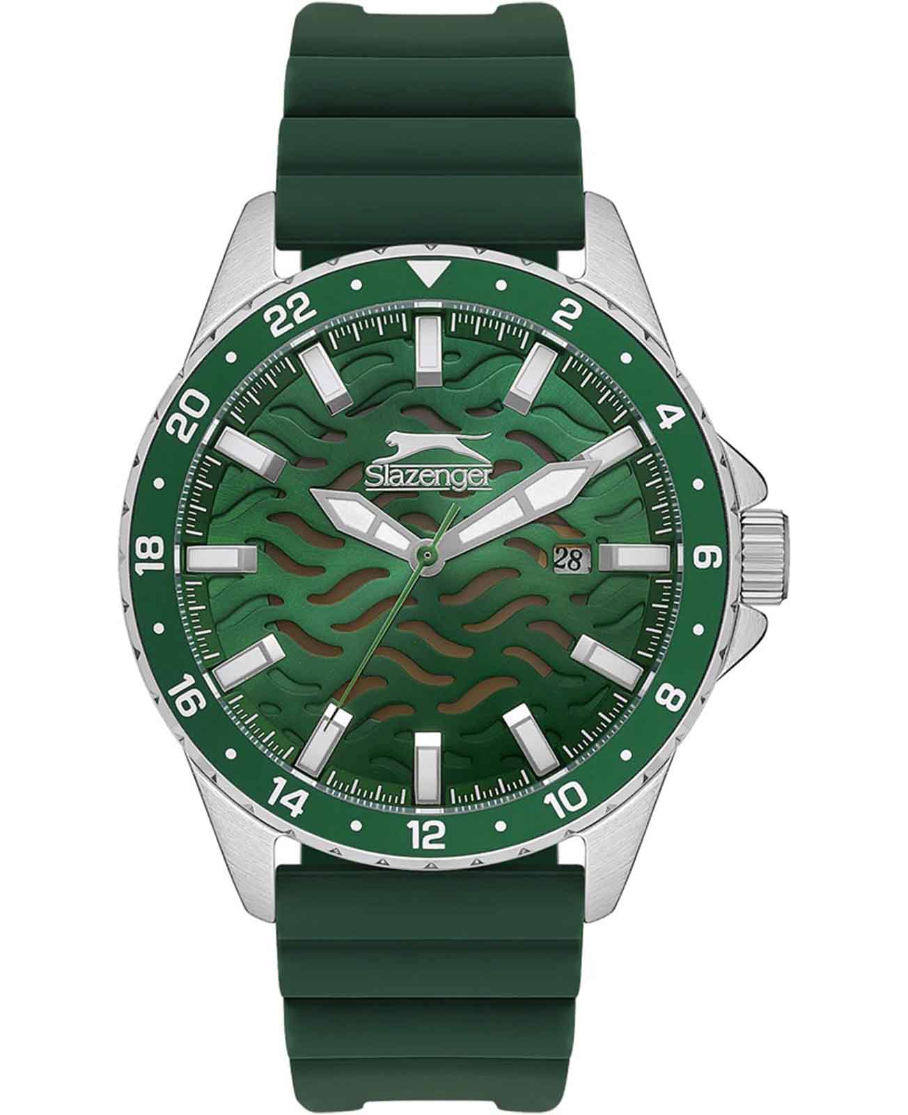 Часы Slazenger SL.09.2224.1.02 — это надежные и стильные наручные часы, созданные в Англии и оснащённые высокоточным кварцевым механизмом. Корпус выполнен из металла и гармонично сочетается с зеленым резиновым ремешком шириной 22 мм, который обеспечивает удобную посадку и фиксируется классической застежкой. Минеральное стеклоМинеральное стеклоМинеральное стекло представляет собой искусственно выращенный минерал кварца. Такое стекло отличается особой устойчивостью к повреждениям и царапинам. Уступает по некоторым качествам сапфировому стеклу. защищает циферблат от царапин, а благодаря водозащите класса WR 50 часы не боятся брызг и дождя. БезельБезельВнешний ободок, закрепляющий стекло. В спортивных часах так называется поворотное кольцо с делениями на циферблате, выполняет роль таймера – замеряет отрезки времени на шкале. Неподвижный безель – элемент декора. Однонаправленно вращающийся безель на дайверских часах позволяет фиксировать моменты погружения и выныривания на поверхность. с зеленым IP-покрытиемIP-покрытиеМетод ионного напыления. Демонстрирует повышенную устойчивость к истиранию, окислению и химическим веществам. Под воздействием высокого давления и температуры около 1500°C молекулы металла надёжно соединяются с частицами корпуса часов. придает часам дополнительную прочность и устойчивость к износу. Модель отличается крупным корпусом диаметром 45 мм и толщиной 12 мм, вес изделия — 80 грамм. Стрелки и метки снабжены люминесцентным покрытиемЛюминесцентное покрытиеПозволяет считывать показания времени в темноте. Производители наносят на стрелки, часовые индексы, безель или поверхность циферблата светонакопительный состав, дающий холодное свечение., что позволяет легко считывать время в темноте, а также есть окошко даты и защищённая заводная головка. Эта модель станет отличным выбором для тех, кто ценит функциональность, надежность и современный дизайн.