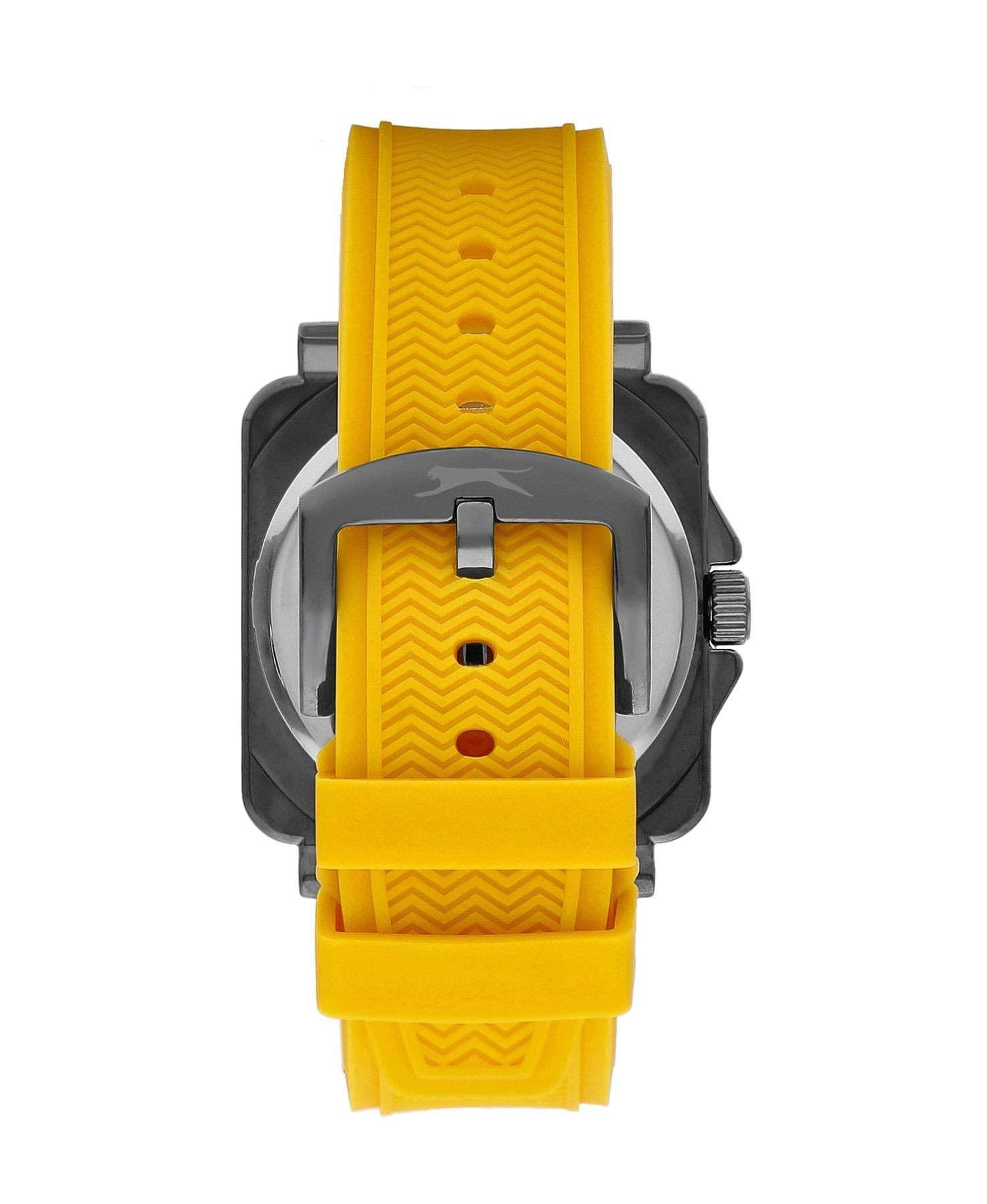 Часы Slazenger SL.09.2233.1.02 — это современная модель, сочетающая стиль и практичность. Корпус квадратной формы выполнен из прочного металла с серым IP-покрытиеIP-покрытиеМетод ионного напыления. Демонстрирует повышенную устойчивость к истиранию, окислению и химическим веществам. Под воздействием высокого давления и температуры около 1500°C молекулы металла надёжно соединяются с частицами корпуса часов., а круглый желтый циферблат придает дизайну особую выразительность. На вращающийся безельБезельВнешний ободок, закрепляющий стекло. В спортивных часах так называется поворотное кольцо с делениями на циферблате, выполняет роль таймера – замеряет отрезки времени на шкале. Неподвижный безель – элемент декора. Однонаправленно вращающийся безель на дайверских часах позволяет фиксировать моменты погружения и выныривания на поверхность. нанесено черное IP-покрытиеIP-покрытиеМетод ионного напыления. Демонстрирует повышенную устойчивость к истиранию, окислению и химическим веществам. Под воздействием высокого давления и температуры около 1500°C молекулы металла надёжно соединяются с частицами корпуса часов.. Резиновый желтый ремешок с классической застежкой обеспечивает удобство при повседневном ношении. Модель оснащена кварцевым механизмом, минеральное стеклоМинеральное стеклоМинеральное стекло представляет собой искусственно выращенный минерал кварца. Такое стекло отличается особой устойчивостью к повреждениям и царапинам. Уступает по некоторым качествам сапфировому стеклу., защищающим от случайных повреждений, и водозащитой уровня WR 50, позволяющей не бояться контакта с водой в повседневных ситуациях. На циферблате расположены окошки даты и дня недели. Для удобства использования в темное время суток предусмотрено люминесцентное покрытиеЛюминесцентное покрытиеПозволяет считывать показания времени в темноте. Производители наносят на стрелки, часовые индексы, безель или поверхность циферблата светонакопительный состав, дающий холодное свечение. стрелок. Заводная головка дополнительно защищена от случайных нажатий. Габариты корпуса составляют 43 на 43 мм, толщина — 11 мм.