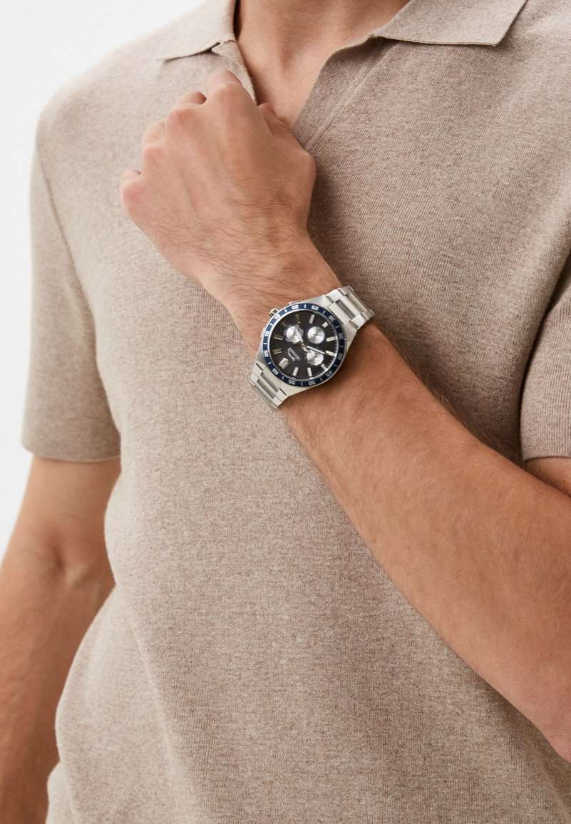 Часы Slazenger SL.09.2285.2.01 — это стильное решение для тех, кто ценит сочетание выразительного дизайна и функциональности. Модель оснащена надежным кварцевым механизмом, который заключен в прочный корпус диаметром 45 мм и толщиной 13 мм, выполненный из суперметалла — современного сплава на основе меди с пониженным содержанием цинка и никеля, обладающего высокой прочностью и устойчивостью к износу, а на безельБезельВнешний ободок, закрепляющий стекло. В спортивных часах так называется поворотное кольцо с делениями на циферблате, выполняет роль таймера – замеряет отрезки времени на шкале. Неподвижный безель – элемент декора. Однонаправленно вращающийся безель на дайверских часах позволяет фиксировать моменты погружения и выныривания на поверхность. нанесено синее IP-покрытиеIP-покрытиеМетод ионного напыления. Демонстрирует повышенную устойчивость к истиранию, окислению и химическим веществам. Под воздействием высокого давления и температуры около 1500°C молекулы металла надёжно соединяются с частицами корпуса часов. и секундная шкала. Минеральное стеклоМинеральное стеклоМинеральное стекло представляет собой искусственно выращенный минерал кварца. Такое стекло отличается особой устойчивостью к повреждениям и царапинам. Уступает по некоторым качествам сапфировому стеклу. защищает черный циферблат от царапин и повреждений. Часы оснащены дополнительными циферблатами для отображения 24-часового времени, даты и дня недели, что делает использование еще более удобным. Браслет также выполнен из суперметалла с раскладной застёжкойРаскладная застёжкаТакой тип застёжки используется только на браслетах из металла. Она никогда не раскрывается полностью, происходит разделение на 2 и более частей. Раскладывающая застёжка снизит вероятность потери часов к минимуму. и гармонично дополняет общий облик аксессуара. Циферблат оснащён люминесцентным покрытиемЛюминесцентное покрытиеПозволяет считывать показания времени в темноте. Производители наносят на стрелки, часовые индексы, безель или поверхность циферблата светонакопительный состав, дающий холодное свечение. стрелок и меток, что позволяет легко определять время даже в условиях плохой освещенности. Класс водозащиты 5 АТМ позволяет не бояться случайных брызг и дождя, а гарантия 12 месяцев подтверждает высокое качество изделия.
