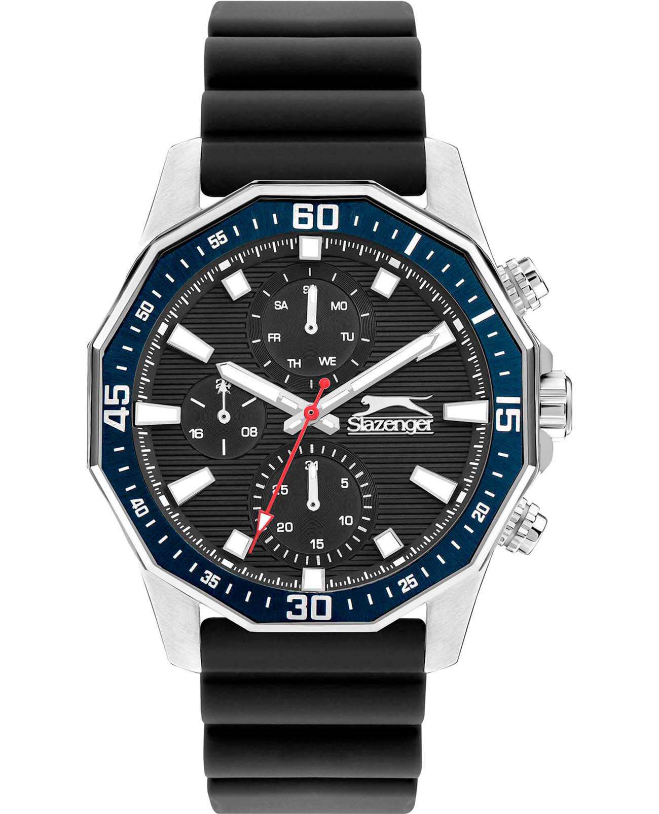 Мужские кварцевые часы Slazenger SL.09.2298.2.01 — это выразительный и функциональный аксессуар, сочетающий прочность, стиль и насыщенную комплектацию. Корпус выполнен из суперметалла с PVD-покрытиемPVDУльтратонкое покрытие наносится в технике вакуумного напыления, сочетает в себе нитрид титана особой прочности со слоем золота или оксида хрома. Несёт в себе декоративную или защитную функцию., а лицевая часть защищена минеральным стекломМинеральное стеклоМинеральное стекло представляет собой искусственно выращенный минерал кварца. Такое стекло отличается особой устойчивостью к повреждениям и царапинам. Уступает по некоторым качествам сапфировому стеклу.. Циферблат чёрного цвета оформлен с вынесенными малыми циферблатами для индикации дня недели, даты и 24-часового формата времени. Стрелки и метки покрыты люминесцентным покрытиемЛюминесцентное покрытиеПозволяет считывать показания времени в темноте. Производители наносят на стрелки, часовые индексы, безель или поверхность циферблата светонакопительный состав, дающий холодное свечение., что обеспечивает хорошую читаемость в темноте. Часы оснащены силиконовым ремешком, фиксирующимся на стандартной застёжке. Водонепроницаемость 50 м позволяет использовать часы в повседневных условиях, защищая от случайных брызг и капель дождя. Модель подчёркивает индивидуальность владельца и идеально подходит как для повседневного, так и для спортивного образа.