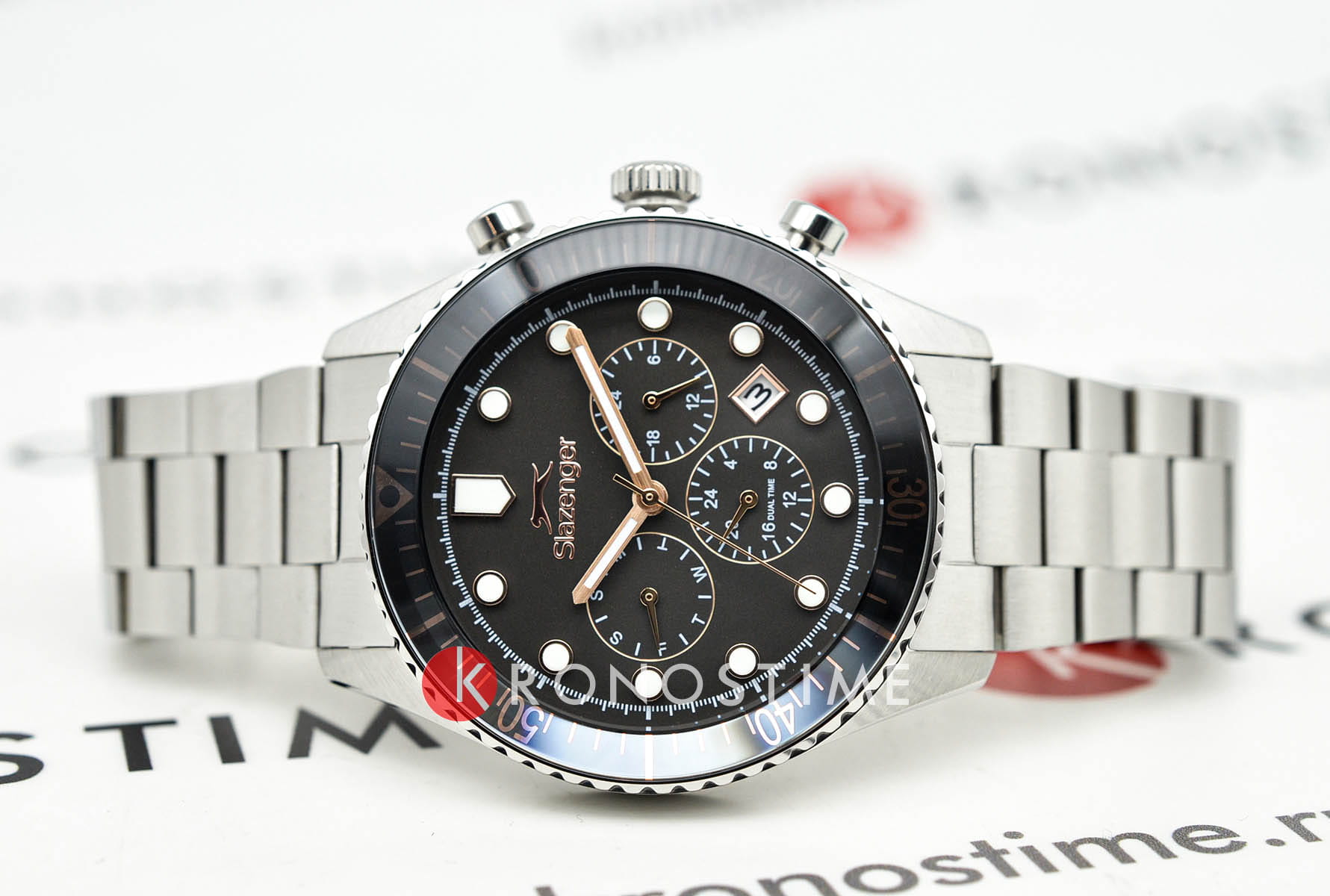 Мужские кварцевые часы Slazenger — это выразительный и функциональный аксессуар. Корпус диаметром 43 мм и толщиной 12 мм выполнен из нержавеющей стали 316L. Циферблат чёрного цвета оформлен индексами и стрелками. Циферблат защищён минеральным стекломМинеральное стеклоМинеральное стекло представляет собой искусственно выращенный минерал кварца. Такое стекло отличается особой устойчивостью к повреждениям и царапинам. Уступает по некоторым качествам сапфировому стеклу.. Механизм — кварцевый. Часы оснащены индикацией дня недели, даты, 12/24-часового формата времени и функцией второго часового пояса (GMT)Второй часовой поясФункция, позволяющая отображать время двух часовых поясов одновременно.. Окошко даты расположено между 4 и 5 часами. Стрелки и метки с люминесцентным покрытиемЛюминесцентное покрытиеПозволяет считывать показания времени в темноте. Производители наносят на стрелки, часовые индексы, безель или поверхность циферблата светонакопительный состав, дающий холодное свечение., обеспечивающим хорошую читаемость в темноте. БезельБезельВнешний ободок, закрепляющий стекло. В спортивных часах так называется поворотное кольцо с делениями на циферблате, выполняет роль таймера – замеряет отрезки времени на шкале. Неподвижный безель – элемент декора. Однонаправленно вращающийся безель на дайверских часах позволяет фиксировать моменты погружения и выныривания на поверхность. с IP-покрытиемIP-покрытиеМетод ионного напыления. Демонстрирует повышенную устойчивость к истиранию, окислению и химическим веществам. Под воздействием высокого давления и температуры около 1500°C молекулы металла надёжно соединяются с частицами корпуса часов.. Часы оснащены стальным браслетом с раскладной застёжкойРаскладная застёжкаТакой тип застёжки используется только на браслетах из металла. Она никогда не раскрывается полностью, происходит разделение на 2 и более частей. Раскладывающая застёжка снизит вероятность потери часов к минимуму.. Водонепроницаемость 100 м позволяет использовать часы для плавания и повседневного ношения. Гарантия — 12 месяцев. Идеальный выбор для тех, кто ценит стиль, функциональность и качество.