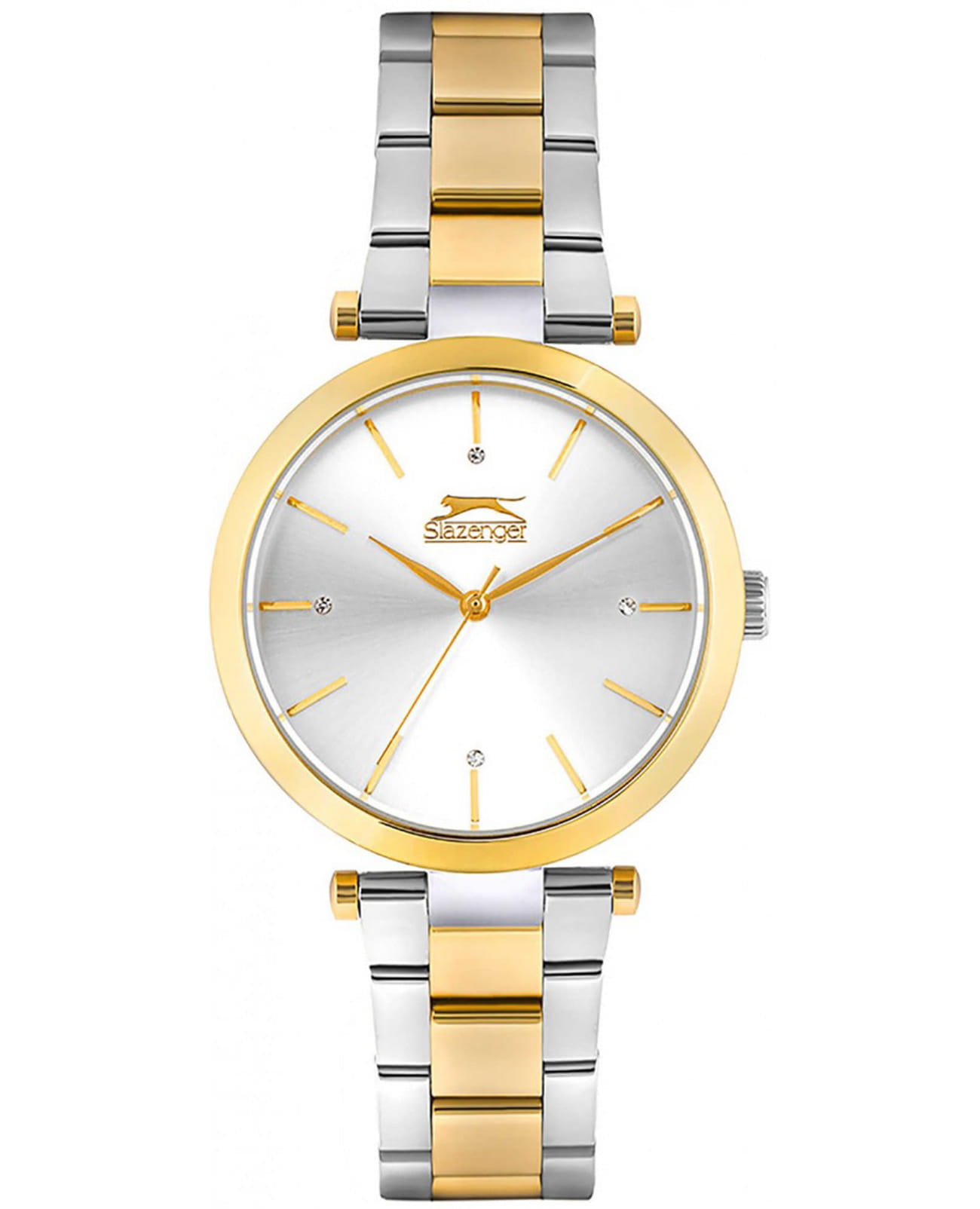 Женские кварцевые часы Slazenger — это элегантный аксессуар. Корпус диаметром 36 мм и толщиной 8 мм выполнен из суперметалла. БезельБезельВнешний ободок, закрепляющий стекло. В спортивных часах так называется поворотное кольцо с делениями на циферблате, выполняет роль таймера – замеряет отрезки времени на шкале. Неподвижный безель – элемент декора. Однонаправленно вращающийся безель на дайверских часах позволяет фиксировать моменты погружения и выныривания на поверхность. с IP-покрытиемIP-покрытиеМетод ионного напыления. Демонстрирует повышенную устойчивость к истиранию, окислению и химическим веществам. Под воздействием высокого давления и температуры около 1500°C молекулы металла надёжно соединяются с частицами корпуса часов.. Циферблат серебристого цвета оформлен индексами, стрелками и украшен фианитами. Циферблат защищён минеральным стекломМинеральное стеклоМинеральное стекло представляет собой искусственно выращенный минерал кварца. Такое стекло отличается особой устойчивостью к повреждениям и царапинам. Уступает по некоторым качествам сапфировому стеклу.. Механизм — кварцевый калибр Miyota 2035. Часы оснащены браслетом из суперметалла на застёжке «бабочка» с кнопкамиЗастёжка "бабочка"Такой вид застёжки дополняется предохранителями, помогающими избежать случайного раскрытия браслета. Обладают изящным исполнением. . Водонепроницаемость 30 м позволяет использовать часы в повседневных условиях. Идеальный выбор для тех, кто ценит стиль и качество.