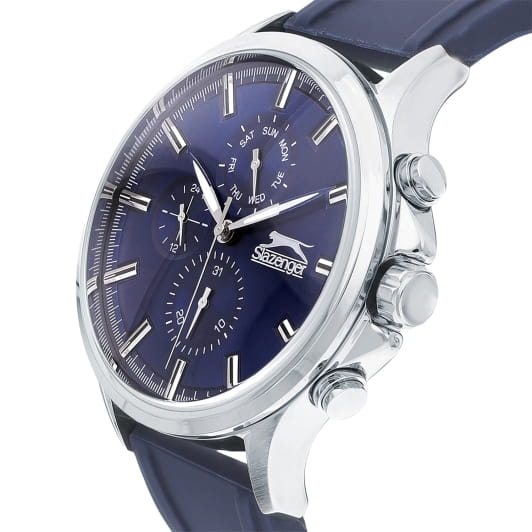 Мужские кварцевые часы Slazenger — это выразительный и функциональный аксессуар. Корпус диаметром 47 мм и толщиной 15 мм выполнен из суперметалла. Циферблат синего цвета оформлен индексами, стрелками и тремя вынесенными субциферблатами: для отображения дня недели, даты и 24-часового формата времени. Стрелки с люминесцентным покрытиемЛюминесцентное покрытиеПозволяет считывать показания времени в темноте. Производители наносят на стрелки, часовые индексы, безель или поверхность циферблата светонакопительный состав, дающий холодное свечение., обеспечивающим читаемость в темноте. Циферблат защищён минеральным стекломМинеральное стеклоМинеральное стекло представляет собой искусственно выращенный минерал кварца. Такое стекло отличается особой устойчивостью к повреждениям и царапинам. Уступает по некоторым качествам сапфировому стеклу.. Часы оснащены силиконовым ремешком на классической пряжке. Водонепроницаемость 50 м позволяет использовать часы в повседневных условиях. Идеальный выбор для тех, кто ценит стиль и качество.
