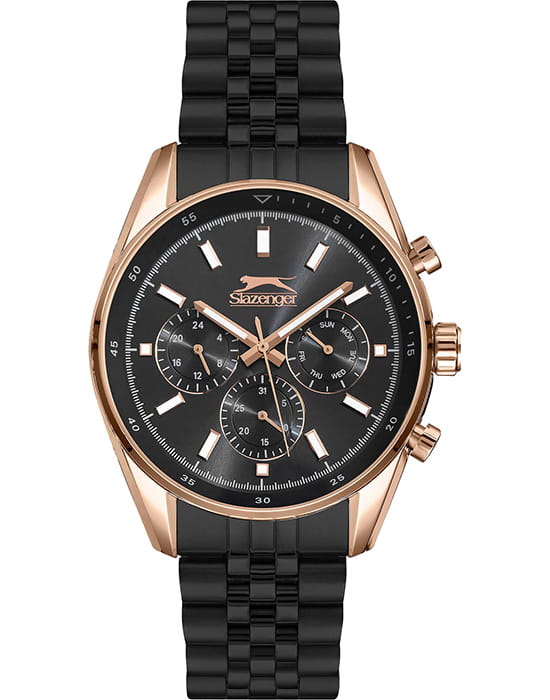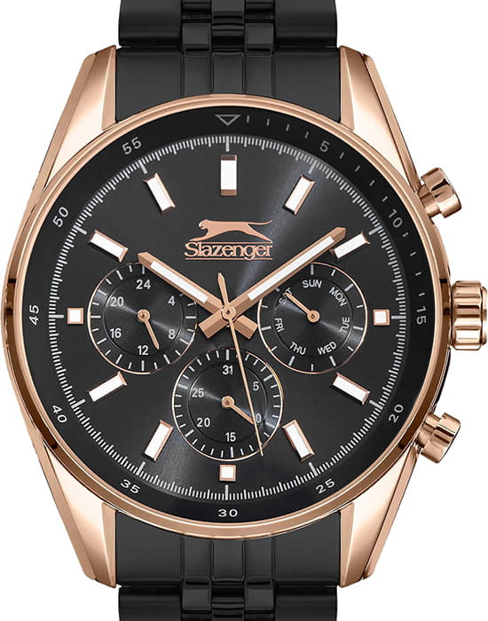 Slazenger SL.09.6507.2.03 — стильные мужские часы, сочетающие элегантный дизайн и функциональность. Корпус выполнен из суперметалла, придающей модели прочность и долговечность. Минеральное стеклоМинеральное стеклоМинеральное стекло представляет собой искусственно выращенный минерал кварца. Такое стекло отличается особой устойчивостью к повреждениям и царапинам. Уступает по некоторым качествам сапфировому стеклу. защищает циферблат от царапин и гарантирует превосходную читаемость. БезельБезельВнешний ободок, закрепляющий стекло. В спортивных часах так называется поворотное кольцо с делениями на циферблате, выполняет роль таймера – замеряет отрезки времени на шкале. Неподвижный безель – элемент декора. Однонаправленно вращающийся безель на дайверских часах позволяет фиксировать моменты погружения и выныривания на поверхность. с PVD-покрытиемPVDУльтратонкое покрытие наносится в технике вакуумного напыления, сочетает в себе нитрид титана особой прочности со слоем золота или оксида хрома. Несёт в себе декоративную или защитную функцию.. Черный циферблат с дополнительными индикаторами подчёркивает современный стиль. Браслет из суперметалла обеспечивает комфортное ношение и надёжную фиксацию на запястье. Функциональность дополняется индикацией даты, дня недели и 24-часовым форматом времени, повышая удобство использования. Водонепроницаемость 50 метров делает модель устойчивой к случайным брызгам и влаге, идеально подходя для повседневного ношения.