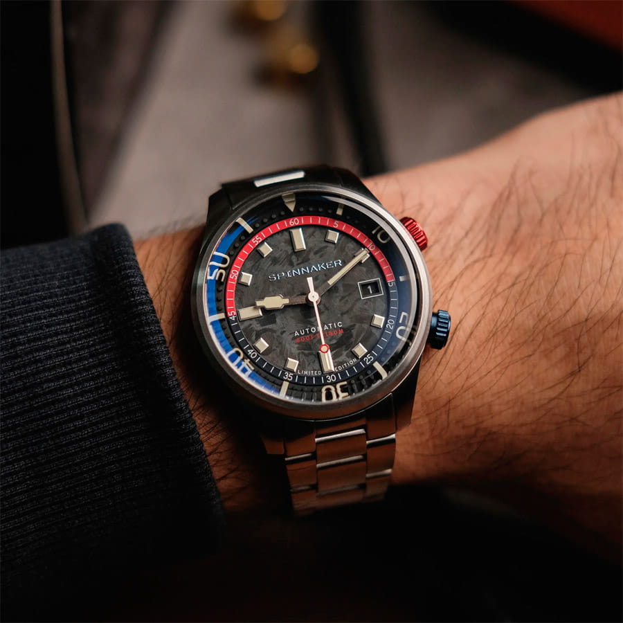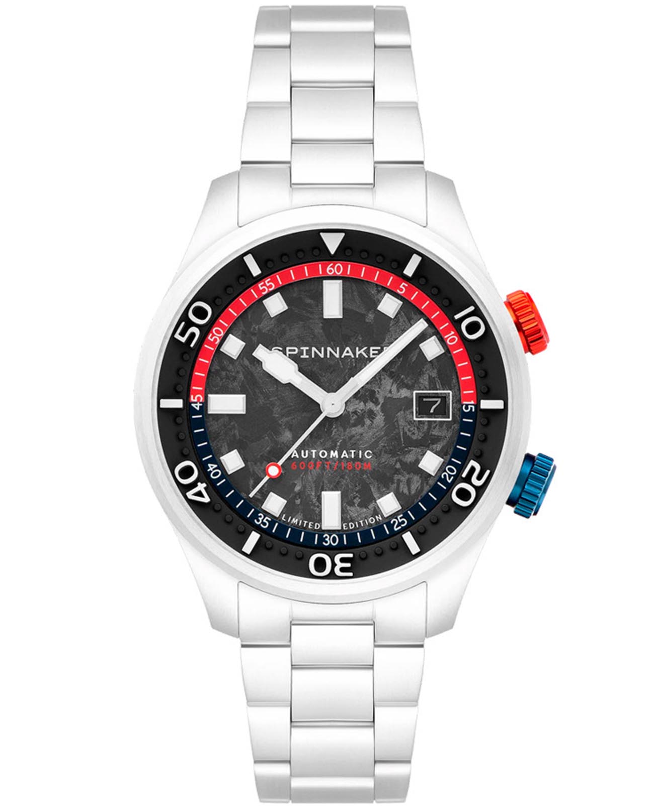 Мужские итальянские часы Spinnaker Bradner SP-5111-11 из лимитированной серии (600 экземпляров). Механический механизм с высокой точностью. Циферблат с люминесцентным покрытиемЛюминесцентное покрытиеПозволяет считывать показания времени в темноте. Производители наносят на стрелки, часовые индексы, безель или поверхность циферблата светонакопительный состав, дающий холодное свечение. стрелок, меток и поворотный безельБезельВнешний ободок, закрепляющий стекло. В спортивных часах так называется поворотное кольцо с делениями на циферблате, выполняет роль таймера – замеряет отрезки времени на шкале. Неподвижный безель – элемент декора. Однонаправленно вращающийся безель на дайверских часах позволяет фиксировать моменты погружения и выныривания на поверхность. дополнен сапфировым стекломСапфировое стеклоПрочный и надёжный материал из кристалла сапфира синтетического происхождения, характеризующийся особой твёрдостью и устойчивостью к царапинам и повреждениям. с антибликовым покрытиемАнтибликовое покрытиеСлой оксида металла в 0,13-0,3 микрон, благодаря которому стекло часов не бликует и не отражает свет. Антибликовое покрытие уменьшает отражение света в 10 раз, обеспечивая отличную читаемость показателей циферблата., устойчивым к появлению царапин и обладающее высокой прозрачностью. Класс водозащиты: 300 метров, позволит плавать, нырять и заниматься другими водными видами спорта. Корпус часов изготовлен из стали. Браслет выполнен из нержавеющей стали.Ширина браслета 20 мм.