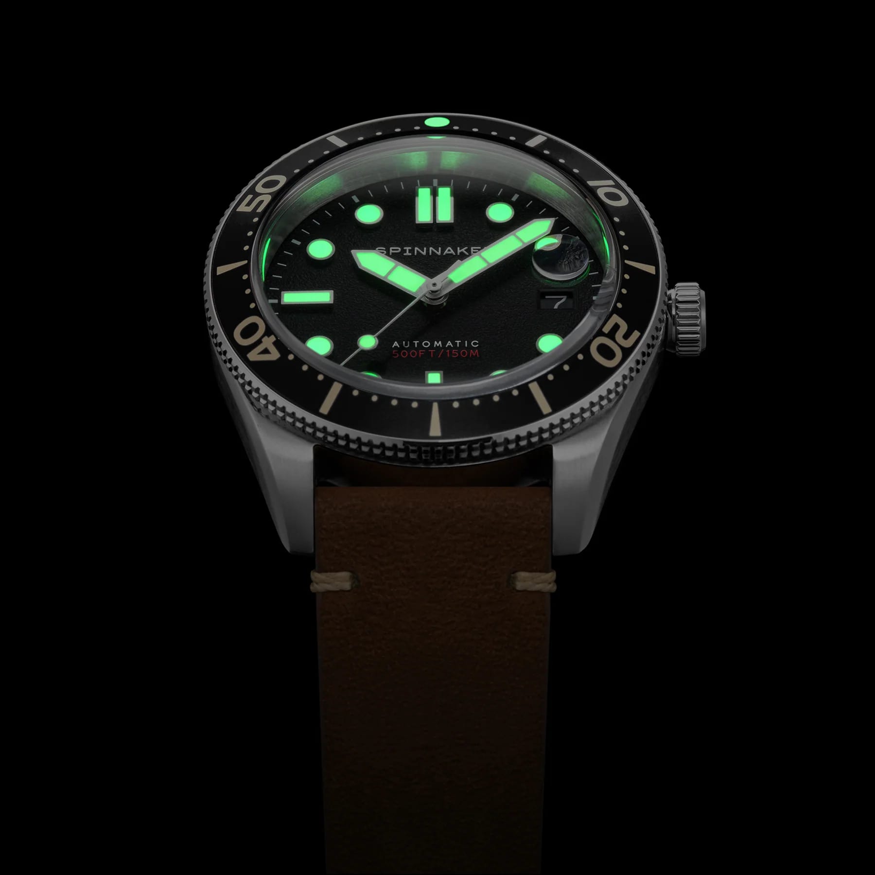 Мужские итальянские часы Spinnaker Croft SP-5100-01, механический механизм (автоматический калибр) с высокой точностью. Циферблат с люминесцентным покрытиемЛюминесцентное покрытиеПозволяет считывать показания времени в темноте. Производители наносят на стрелки, часовые индексы, безель или поверхность циферблата светонакопительный состав, дающий холодное свечение. стрелок и меток, дополнен сапфировым стекломСапфировое стеклоПрочный и надёжный материал из кристалла сапфира синтетического происхождения, характеризующийся особой твёрдостью и устойчивостью к царапинам и повреждениям., устойчивым к появлению царапин и обладающее высокой прозрачностью. Класс водозащиты: 150 метров, позволит плавать, нырять и заниматься другими водными видами спорта. Корпус часов изготовлен из усовершенствованной стали 316L. Апертура даты с увеличительным стеклом в позиции 3 часов. Коричневый кожаный ремешок толщиной 20 мм, стандартная застежка. Вращающийся стальной безельБезельВнешний ободок, закрепляющий стекло. В спортивных часах так называется поворотное кольцо с делениями на циферблате, выполняет роль таймера – замеряет отрезки времени на шкале. Неподвижный безель – элемент декора. Однонаправленно вращающийся безель на дайверских часах позволяет фиксировать моменты погружения и выныривания на поверхность. с PVD-покрытиемPVDУльтратонкое покрытие наносится в технике вакуумного напыления, сочетает в себе нитрид титана особой прочности со слоем золота или оксида хрома. Несёт в себе декоративную или защитную функцию..
