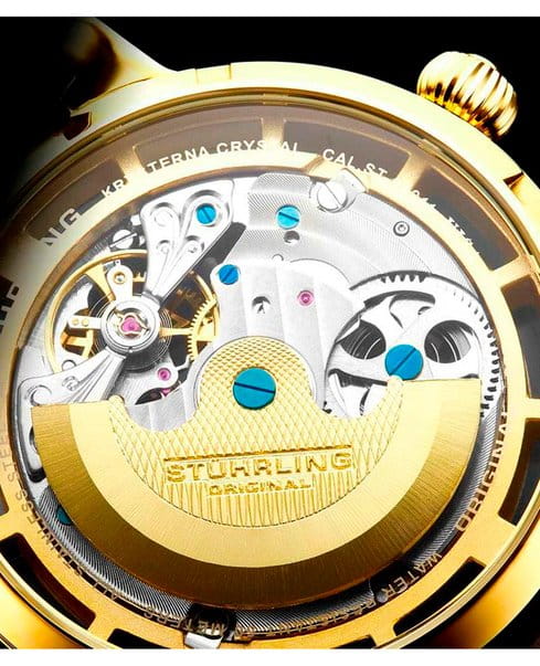 Мужские наручные часы Stührling Original 371B.03 из коллекции Luciano Automatic Skeleton сочетают в себе классический дизайн и современные технологии . Модель оснащена механическим механизмом с автоподзаводом, что гарантирует точность хода без необходимости ручного завода . Корпус часов диаметром 47 мм изготовлен из нержавеющей стали с PVD-покрытиемPVDУльтратонкое покрытие наносится в технике вакуумного напыления, сочетает в себе нитрид титана особой прочности со слоем золота или оксида хрома. Несёт в себе декоративную или защитную функцию. под золото, что подчеркивает элегантность модели . Защиту циферблата обеспечивает прочное стекло KrysternaKrysternaKrysterna — инновационное стекло для наручных часов. Благодаря уникальной структуре, Krysterna объединяет ключевые преимущества двух материалов: твердость сапфира, защищающую от царапин, и гибкость минерального стекла, обеспечивающую устойчивость к деформациям. Такая комбинация делает его идеальным решением для часов, подверженных экстремальным нагрузкам, сохраняя при этом оптическую прозрачность., известное своей устойчивостью к царапинам и механическим повреждениям . Циферблат выполнен в стиле , что позволяет наблюдать за работой внутреннего механизма и демонстрирует сложность инженерного решения . Такой дизайн делает модель не только функциональной, но и стильной, привлекая внимание ценителей сложных технических решений. Браслет из того же материала на раскладной застёжкеРаскладная застёжкаТакой тип застёжки используется только на браслетах из металла. Она никогда не раскрывается полностью, происходит разделение на 2 и более частей. Раскладывающая застёжка снизит вероятность потери часов к минимуму.. Водонепроницаемость модели достигает 5 атмосфер (50 метров), что позволяет использовать их в повседневных условиях, включая контакт с водой, например, при мытье рук или дожде . Заводная головка с системой завинчивания обеспечивает дополнительную защиту механизма от внешних воздействий.