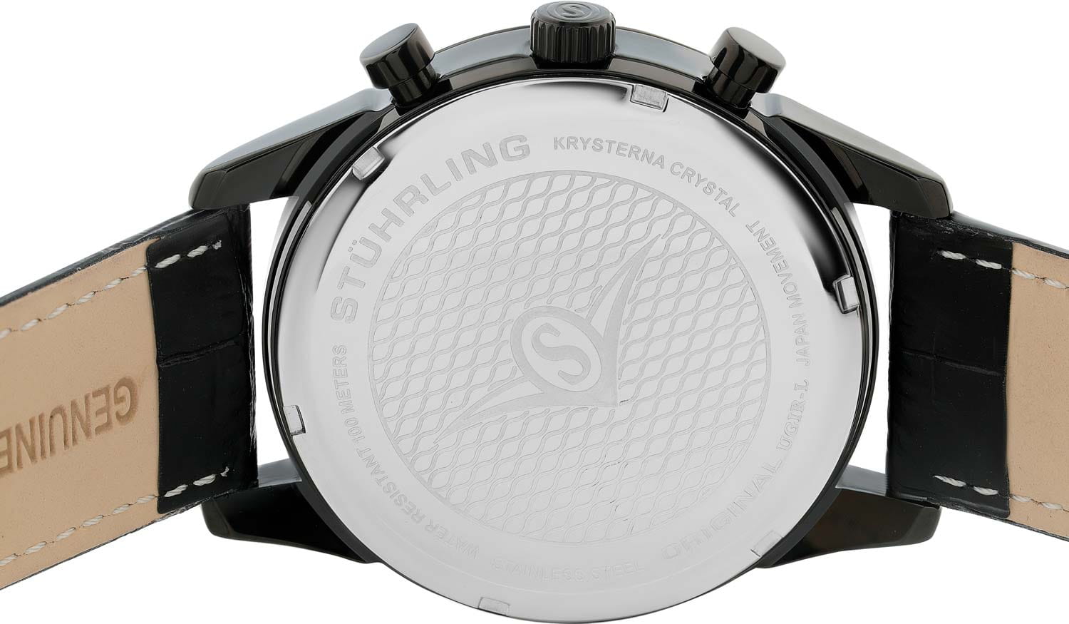 Stuhrling 3975L.3 — стильные мужские часы с выразительным пилотским дизайном и мощным функционалом. Классический циферблат дополнен контрастными счётчиками хронографаХронографФункция позволяет измерять отрезки времени с особой точностью: часы, минуты, секунды. Верным признаком хронографа является наличие на циферблате 3 дополнительных окошек-счётчиков., тахиметрической шкалой по ободу и аккуратным окошком даты, подчёркивающими технический характер модели. Корпус из нержавеющей стали с PVD-покрытиемPVDУльтратонкое покрытие наносится в технике вакуумного напыления, сочетает в себе нитрид титана особой прочности со слоем золота или оксида хрома. Несёт в себе декоративную или защитную функцию. придаёт часам надёжность и современный блеск, а стекло KrysternaKrysternaKrysterna — инновационное стекло для наручных часов. Благодаря уникальной структуре, Krysterna объединяет ключевые преимущества двух материалов: твердость сапфира, защищающую от царапин, и гибкость минерального стекла, обеспечивающую устойчивость к деформациям. Такая комбинация делает его идеальным решением для часов, подверженных экстремальным нагрузкам, сохраняя при этом оптическую прозрачность. защищает поверхность от царапин и сохраняет кристальную прозрачность. Кожаный ремень с классической текстурой аллигатора и стандартной застежкой, обеспечивает комфорт и элегантную посадку на запястье. Stuhrling — гармония силы, точности и изысканного стиля для мужчин, ценящих уверенность и безупречный вкус.
