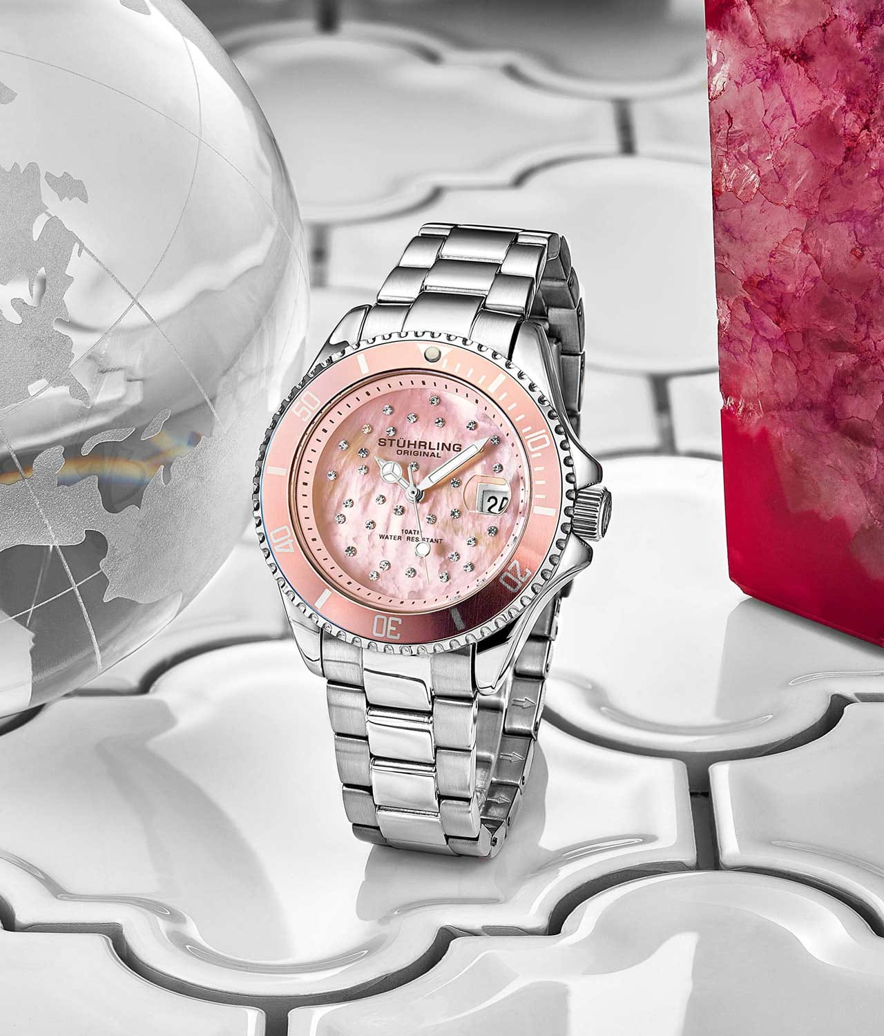 Stuhrling 3977.4 — элегантные женские часы, созданные в стиле роскошного дайвера. Корпус из нержавеющей стали придают модели блеск и надёжность, а глубокий циферблат, украшенный мерцающими кристаллами, создаёт эффект звёздного неба. БезельБезельВнешний ободок, закрепляющий стекло. В спортивных часах так называется поворотное кольцо с делениями на циферблате, выполняет роль таймера – замеряет отрезки времени на шкале. Неподвижный безель – элемент декора. Однонаправленно вращающийся безель на дайверских часах позволяет фиксировать моменты погружения и выныривания на поверхность. с PVD-покрытиемPVDУльтратонкое покрытие наносится в технике вакуумного напыления, сочетает в себе нитрид титана особой прочности со слоем золота или оксида хрома. Несёт в себе декоративную или защитную функцию.. Стрелки и метки с люминесцентным покрытиемЛюминесцентное покрытиеПозволяет считывать показания времени в темноте. Производители наносят на стрелки, часовые индексы, безель или поверхность циферблата светонакопительный состав, дающий холодное свечение. обеспечивают хорошую видимость в любых условиях. Прочное стекло KrysternaKrysternaKrysterna — инновационное стекло для наручных часов. Благодаря уникальной структуре, Krysterna объединяет ключевые преимущества двух материалов: твердость сапфира, защищающую от царапин, и гибкость минерального стекла, обеспечивающую устойчивость к деформациям. Такая комбинация делает его идеальным решением для часов, подверженных экстремальным нагрузкам, сохраняя при этом оптическую прозрачность. защищает поверхность от царапин, сохраняя безупречный блеск. Завершает образ стальной браслет с раскладной застёжкойРаскладная застёжкаТакой тип застёжки используется только на браслетах из металла. Она никогда не раскрывается полностью, происходит разделение на 2 и более частей. Раскладывающая застёжка снизит вероятность потери часов к минимуму., подчёркивающий изысканность и удобство ношения. Stuhrling — это гармония женственности, уверенности и сияющего стиля.