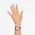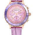 Часы Swarovski 5632263 – это роскошные женские часы с секундомеромСекундомерСекундоме́р — прибор, способный измерять интервалы времени с точностью до долей секунды. и хронографомХронографФункция позволяет измерять отрезки времени с особой точностью: часы, минуты, секунды. Верным признаком хронографа является наличие на циферблате 3 дополнительных окошек-счётчиков., поистине, образец точности и роскоши, ведь они сочетают в себе лучшие традиции швейцарского часового искусства и неповторимое мастерство Swarovski. Прекрасный аксессуар, подходящий к любому повседневному образу. Часы имеют функцию хронографаХронографФункция позволяет измерять отрезки времени с особой точностью: часы, минуты, секунды. Верным признаком хронографа является наличие на циферблате 3 дополнительных окошек-счётчиков., позволяющую запустить отсчет, остановить его и обнулить результаты. Корпус из нержавеющей стали с PVDPVDУльтратонкое покрытие наносится в технике вакуумного напыления, сочетает в себе нитрид титана особой прочности со слоем золота или оксида хрома. Несёт в себе декоративную или защитную функцию. покрытием оттенка розового золота гармонично сочетается с огранённым кристальным безелемБезельВнешний ободок, закрепляющий стекло. В спортивных часах так называется поворотное кольцо с делениями на циферблате, выполняет роль таймера – замеряет отрезки времени на шкале. Неподвижный безель – элемент декора. Однонаправленно вращающийся безель на дайверских часах позволяет фиксировать моменты погружения и выныривания на поверхность., который встречается только в коллекции часов Swarovski. Его фиолетовое сияние удачно сочетается с фиолетовым циферблатом с рисунком в виде солнечных лучей и ремешком из натуральной кожи с тиснением под крокодила. Надежное минеральное стеклоМинеральное стеклоМинеральное стекло представляет собой искусственно выращенный минерал кварца. Такое стекло отличается особой устойчивостью к повреждениям и царапинам. Уступает по некоторым качествам сапфировому стеклу. защищает часы от царапин и долго сохраняет первоначальный внешний вид. На часовую, минутную стрелки нанесено люминесцентное покрытиеЛюминесцентное покрытиеПозволяет считывать показания времени в темноте. Производители наносят на стрелки, часовые индексы, безель или поверхность циферблата светонакопительный состав, дающий холодное свечение., которое светится в темноте, создавая необычное изображение. Эти часы станут не просто аксессуаром, а настоящим украшением, подчеркивающим индивидуальность и утонченность своей владелицы.
