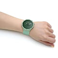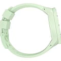 Часы Swatch SB03G100 — это стильный и современный аксессуар для тех, кто ценит лёгкость и комфорт. Часы идеально подойдут как для мужчин, так и для женщин. Корпус из биокерамикиБиокерамикаБиокерамика — это материал, который на две трети состоит из керамики, на одну треть — из биопластика. Он сочетает в себе лучшие качества обоих материалов и обладает прочностью и шелковистой на ощупь текстурой., а ремешок — из однотонного матово-зеленого силикона. Темно-зеленый циферблат подчеркивает белые акценты на темных стрелках. Секундная стрелка, прообразом которой стала стрелка компаса, усиливает дух приключений. На часовую и минутную стрелки нанесено люминесцентное покрытиеЛюминесцентное покрытиеПозволяет считывать показания времени в темноте. Производители наносят на стрелки, часовые индексы, безель или поверхность циферблата светонакопительный состав, дающий холодное свечение., которое светится в темноте, создавая необычное изображение. Водозащита 30 метров делает часы практичными для повседневного использования. Эти часы подойдут для повседневного ношения и станут ярким акцентом в вашем наряде.