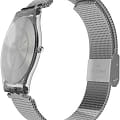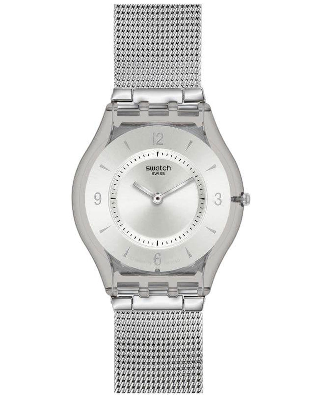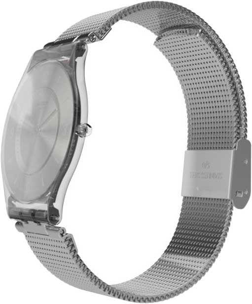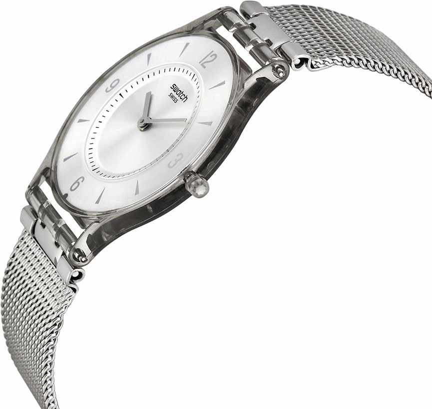 Швейцарские наручные часы Swatch SFM118M. Эти современные и легкие женские часы относятся к коллекции Skin, изготовлены из сверхтонкого и точного кварца швейцарского производства. Ультратонкие, толщина 3.9 мм, диаметр корпуса 34 мм. С водозащитой до 30 метров они надежно защищают корпус от случайных брызг и капель дождя. Многослойное акриловое стекло, используемое в этих часах, обладает высокой прочностью и трудно разбивается; это легкий прозрачный пластик, который может прогибаться при ударах и не разлетается на осколки. Кроме того, акрил устойчив к перепадам температуры и высокому давлению. Корпус часов выполнен из полимера, а механизм — кварцевый. Кварцевые часы обеспечивают большую точность по сравнению с механическими, с погрешностью хода около 20 секунд в месяц. Они не требуют завода, достаточно менять батарейку раз в несколько лет. Стальной браслет миланского плетения на застежке "раскладной замок", позволяющей легко регулировать браслет по длине.