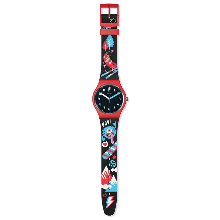 Часы Swatch SO29R105 — стильный и надежный аксессуар. Специалист по сноуборд-кроссу Ксавье Де Лё Рю и его 3-летняя дочь Марго любят экшен и приключения на склоне. После этого они с удовольствием отдыхают в своем шале в Вербье, играя с забавными монстрами или слушая истории. В связи с этим был создан набор, в который входит модель Swatch New Gent SLIDE MASTER в парном стиле (детские часы Swatch SZS38 продаются отдельно!). Красный корпус и черный ремешок изготовлены из биопластика, материала, производимого на основе возобновляемых ресурсов. На нем напечатаны маленькие монстры на лыжах или сноубордах, мчащиеся по склонам. На черном циферблате белые арабские цифры, а минутная стрелка выполнена в светло-голубом цвете, что соответствует индексам по краю. В водонепроницаемых часах установлен точный кварцевый механизм с батареей. Ремешок из биоматериала на стандартной застёжке. Эти часы водонепроницаемы до 30 метров, что позволяет не беспокоиться о случайных брызгах или дождевых каплях. Swatch SO29R105 — это идеальный выбор для тех, кто ценит сочетание стиля, комфорта и функциональности в одном аксессуаре.
