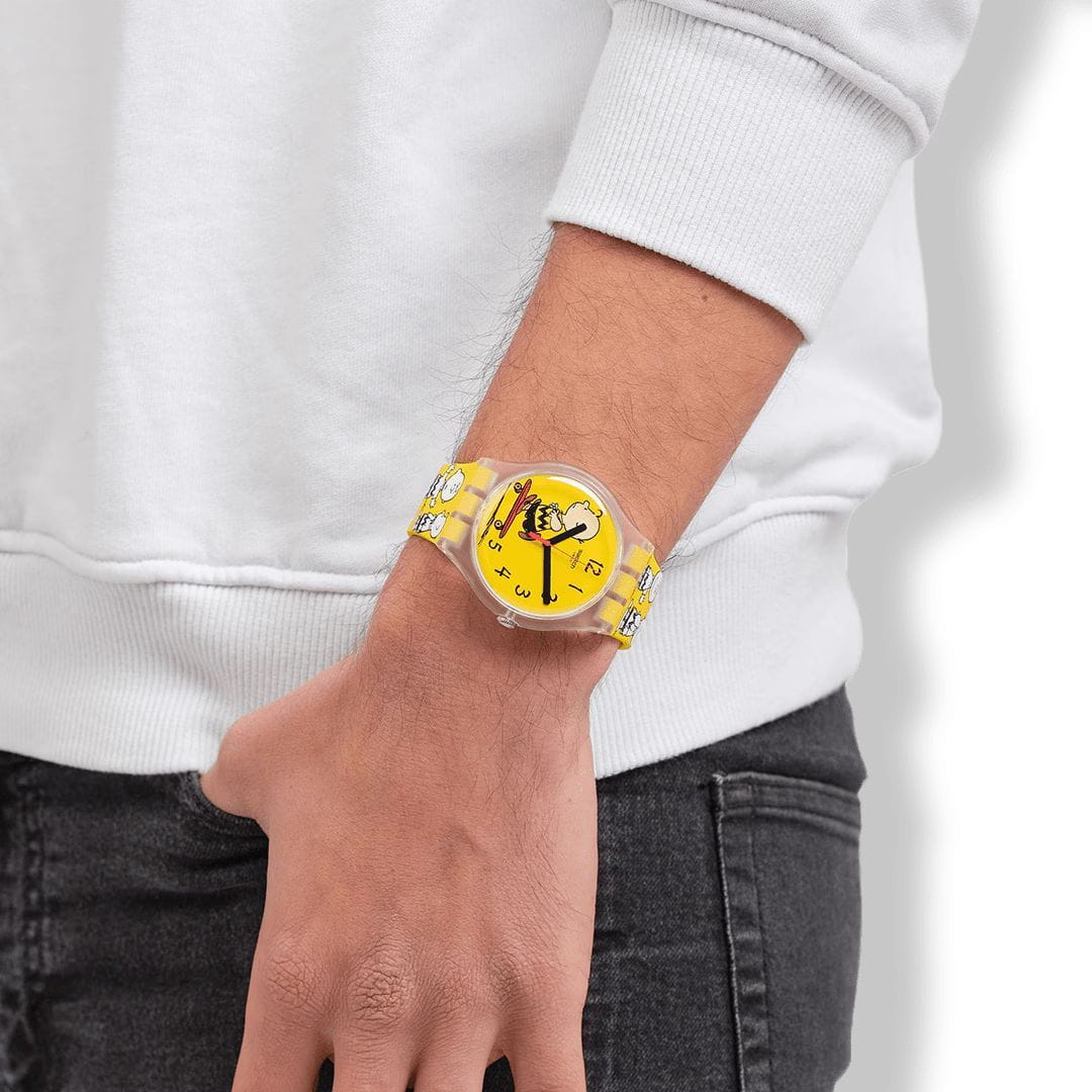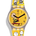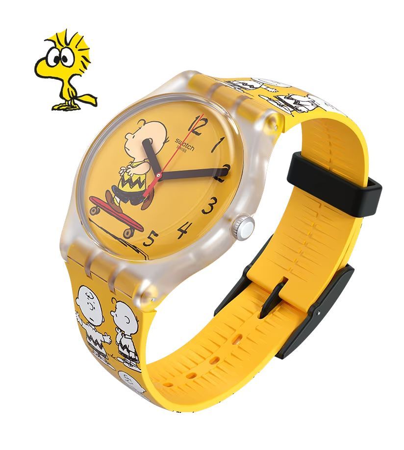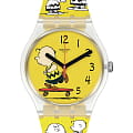 Часы Swatch SO29Z101 —  стильный и надежный аксессуар. Эти позитивные часы имеют прозрачный корпус из биоматериала, желтый силиконовый ремешок, черные стрелки и индексы, принт на всей поверхности Swatch X Peanuts. Циферблат покрыт биостеклом. Мерцающий блеск модели обусловлен особым методом гравированной отделки. Ремешок на классической застежке. Внутри часов установлен надежный кварцевый механизм, который обеспечивает точность хода. Эти часы водонепроницаемы до 30 метров, что позволяет не беспокоиться о случайных брызгах или дождевых каплях. Swatch SO29Z101 — это идеальный выбор для тех, кто ценит сочетание стиля, комфорта и функциональности в одном аксессуаре.