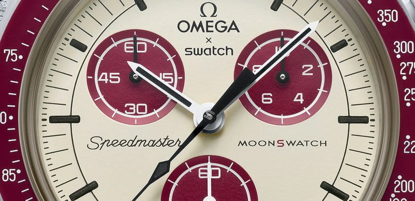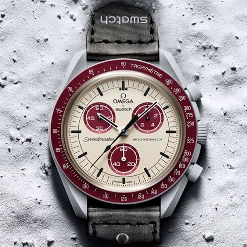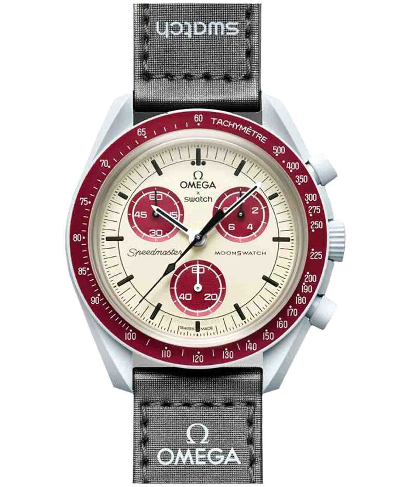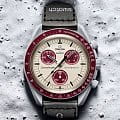 Часы Swatch Bioceramic Moonswatch MISSION TO PLUTO SO33M101 — это стильный и современный аксессуар для тех, кто ценит лёгкость и комфорт. Корпус диаметром 42 мм и пряжка этих уникальных часов изготовлены из биокерамикиБиокерамикаБиокерамика — это материал, который на две трети состоит из керамики, на одну треть — из биопластика. Он сочетает в себе лучшие качества обоих материалов и обладает прочностью и шелковистой на ощупь текстурой., а также ремешок VELCRO®. Модель оснащена циферблатом и бордовым биокерамическим безелемБезельВнешний ободок, закрепляющий стекло. В спортивных часах так называется поворотное кольцо с делениями на циферблате, выполняет роль таймера – замеряет отрезки времени на шкале. Неподвижный безель – элемент декора. Однонаправленно вращающийся безель на дайверских часах позволяет фиксировать моменты погружения и выныривания на поверхность. на который нанесена шкала тахиметраТахиметрРазмеченная шкала, располагается на ободке или безеле часов. Тахиметр позволяет рассчитать скорость на определённом участке пути, расстояние измеряется в километрах или милях.. Общими характеристиками всех часов в данной коллекции являются конструкция стекла из биоматериала, «скрытая» в центре кристалла буква "S", тонкий и изящный круговой узор на внешнем кольце циферблата и заглубленных мини-циферблатах, гладкие ушки с заостренными концами, культовая точка над отметкой 90 на тахиметрической шкале безеля и, конечно же, уникальный материал – биокерамика. Индексы, часовая, минутная и секундная стрелки хронографаХронографФункция позволяет измерять отрезки времени с особой точностью: часы, минуты, секунды. Верным признаком хронографа является наличие на циферблате 3 дополнительных окошек-счётчиков. покрыты люминесцентным покрытиемЛюминесцентное покрытиеПозволяет считывать показания времени в темноте. Производители наносят на стрелки, часовые индексы, безель или поверхность циферблата светонакопительный состав, дающий холодное свечение. Super-LumiNova® класса А, благодаря чему они светятся в темноте. Циферблаты каждых часов в данной коллекции украшены фирменным знаком OMEGA X Swatch, культовым логотипом Speedmaster и логотипом MoonSwatch.