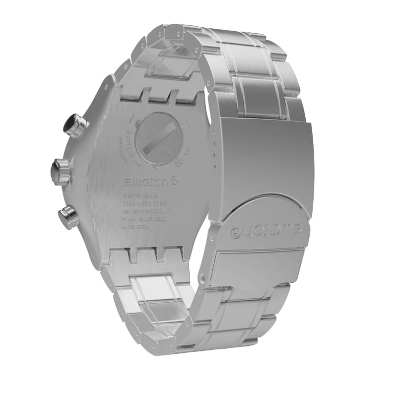 Часы Swatch YVS444GC — это стильный и современный аксессуар для тех, кто ценит лёгкость и комфорт. Этот стильный хронографХронографФункция позволяет измерять отрезки времени с особой точностью: часы, минуты, секунды. Верным признаком хронографа является наличие на циферблате 3 дополнительных окошек-счётчиков. революция стиля, ведь в ней изящно сочетаются спортивный дух и подчеркнутая элегантность. Эти часы оснащены черным циферблатом с радиальной полировкой и белым принтом, а также окошком даты в положении 6 часов и стрелками с люминесцентным покрытиемЛюминесцентное покрытиеПозволяет считывать показания времени в темноте. Производители наносят на стрелки, часовые индексы, безель или поверхность циферблата светонакопительный состав, дающий холодное свечение.. БезельБезельВнешний ободок, закрепляющий стекло. В спортивных часах так называется поворотное кольцо с делениями на циферблате, выполняет роль таймера – замеряет отрезки времени на шкале. Неподвижный безель – элемент декора. Однонаправленно вращающийся безель на дайверских часах позволяет фиксировать моменты погружения и выныривания на поверхность. из полированной стали с черным PVDPVDУльтратонкое покрытие наносится в технике вакуумного напыления, сочетает в себе нитрид титана особой прочности со слоем золота или оксида хрома. Несёт в себе декоративную или защитную функцию. покрытием имеет гравировку, выполненную белой эмалью, и помещен в корпус из полированной нержавеющей стали. Регулируемый браслет с раскладной застёжкойРаскладная застёжкаТакой тип застёжки используется только на браслетах из металла. Она никогда не раскрывается полностью, происходит разделение на 2 и более частей. Раскладывающая застёжка снизит вероятность потери часов к минимуму., напоминающий длинную черную гоночную трассу, изготовлен из нержавеющей стали. Водозащита 30 метров делает часы практичными для повседневного использования. Эти часы подойдут для повседневного ношения и станут ярким акцентом в вашем наряде.