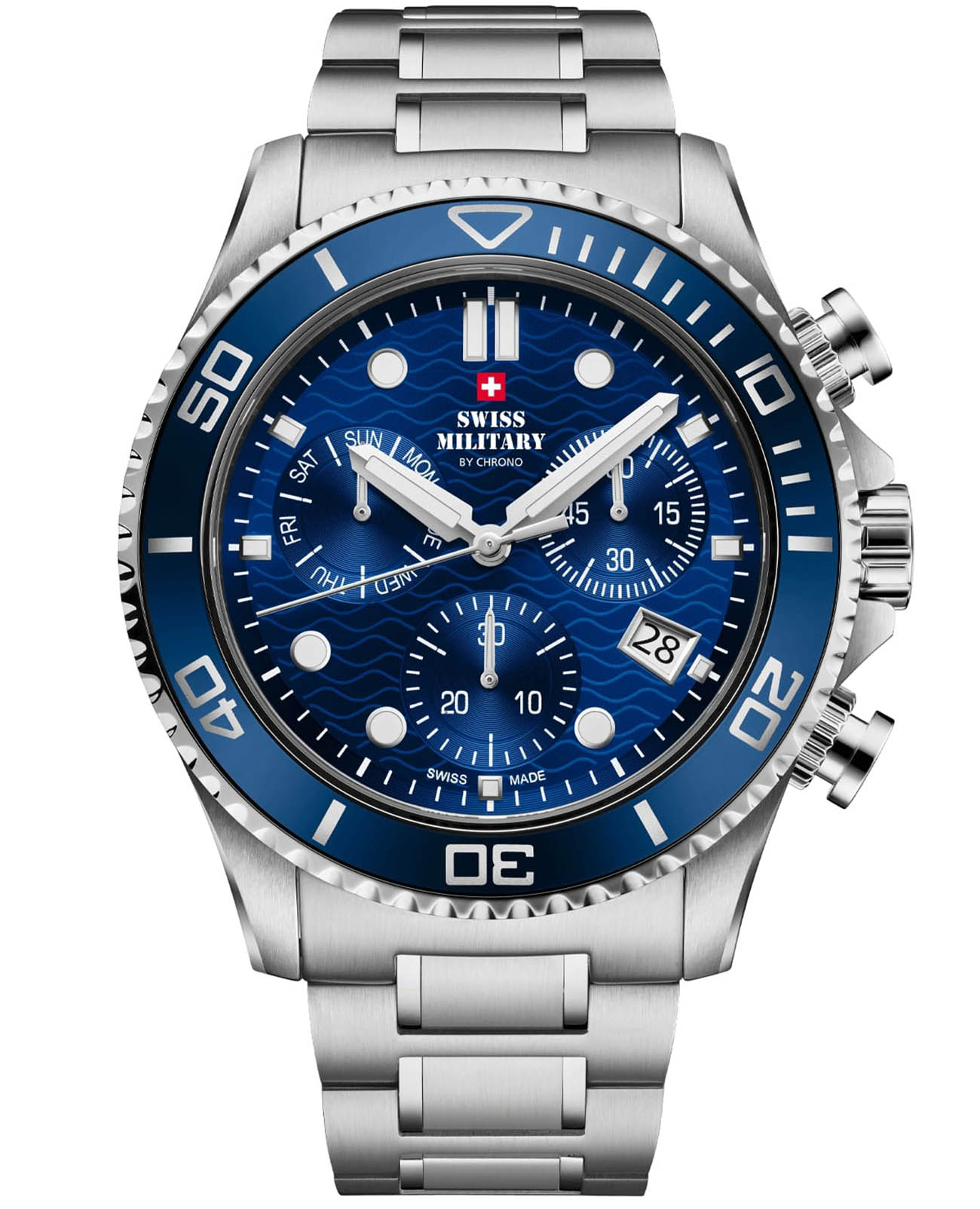 Часы Swiss Military SM34101.02 — это стильный мужской хронограф, который сочетает швейцарское качество и современный дизайн. Корпус диаметром 46 мм и браслет выполнены из нержавеющей стали, что обеспечивает прочность и элегантный внешний вид. Синий циферблат с чёткими часовыми метками и стрелками защищён сапфировым стекломСапфировое стеклоПрочный и надёжный материал из кристалла сапфира синтетического происхождения, характеризующийся особой твёрдостью и устойчивостью к царапинам и повреждениям., устойчивым к царапинам.
