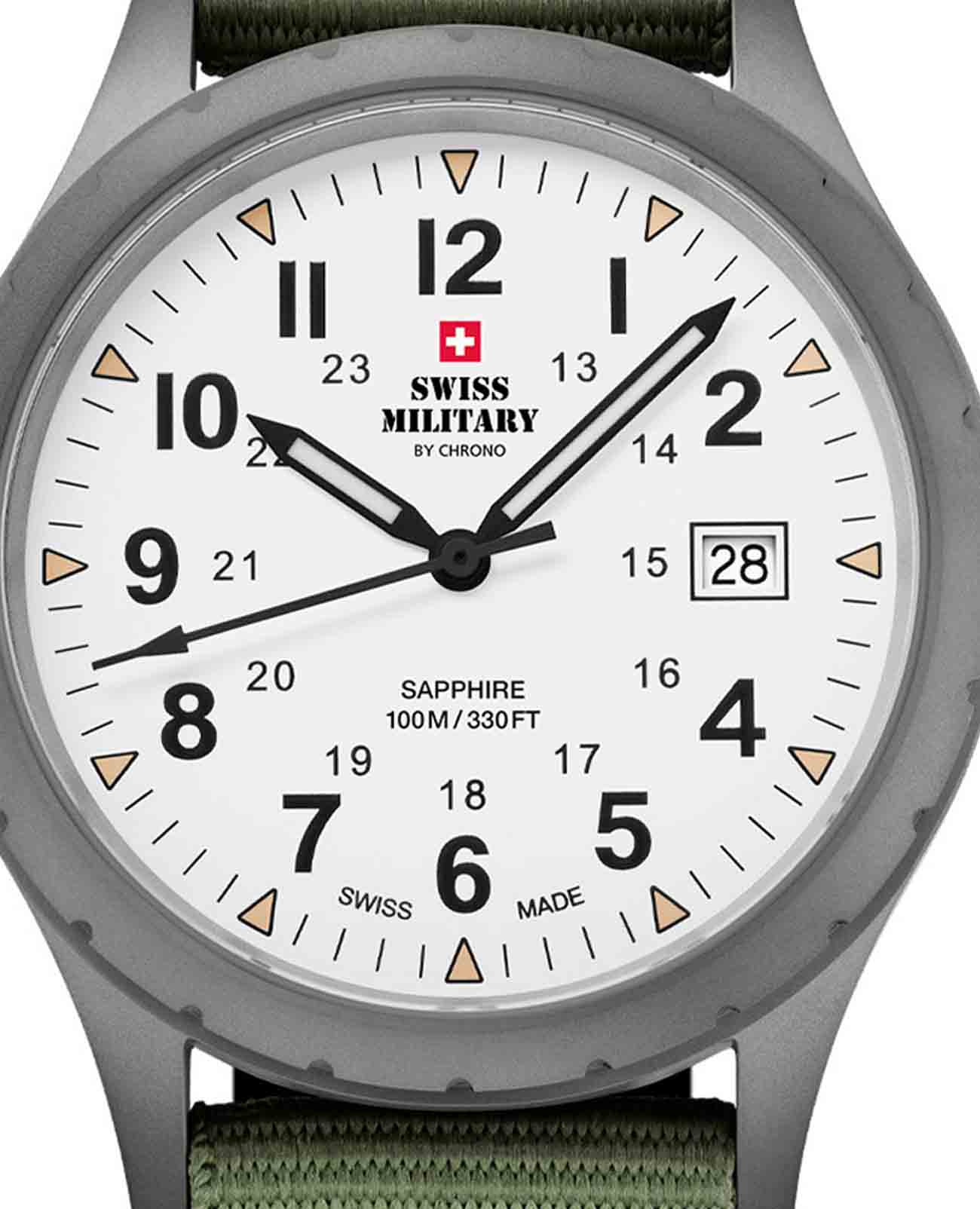 Модель SM34108.04 от Swiss Military by Chrono — это надёжные швейцарские часы в классическом армейском стиле, сочетающие функциональность и сдержанный дизайн. Корпус выполнен из нержавеющей стали с PVD-покрытиемPVDУльтратонкое покрытие наносится в технике вакуумного напыления, сочетает в себе нитрид титана особой прочности со слоем золота или оксида хрома. Несёт в себе декоративную или защитную функцию., подчёркивая прочность и элегантность конструкции. Циферблат с арабскими цифрами обеспечивает отличную читаемость, а функция отображения даты добавляет практичности. Часы оснащены кварцевым механизмом, обеспечивающим точный ход. Циферблат защищён сапфировым стекломСапфировое стеклоПрочный и надёжный материал из кристалла сапфира синтетического происхождения, характеризующийся особой твёрдостью и устойчивостью к царапинам и повреждениям., устойчивым к царапинам. Тканевый ремешок на стандартной застежке для надёжной фиксации на запястье. Модель обладает водонепроницаемостью до 100 метров, что делает её подходящей для плавания и сноркелинга.