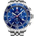 Модель оснащена вращающимся безелемБезельВнешний ободок, закрепляющий стекло. В спортивных часах так называется поворотное кольцо с делениями на циферблате, выполняет роль таймера – замеряет отрезки времени на шкале. Неподвижный безель – элемент декора. Однонаправленно вращающийся безель на дайверских часах позволяет фиксировать моменты погружения и выныривания на поверхность. синего цвета, что добавляет дополнительную функциональность. Водозащита до 10 ATM делает часы подходящими для плавания и других водных активностей. Швейцарский кварцевый механизм Ronda 5040.D обеспечивает высокую точность измерения времени и функции хронографа.