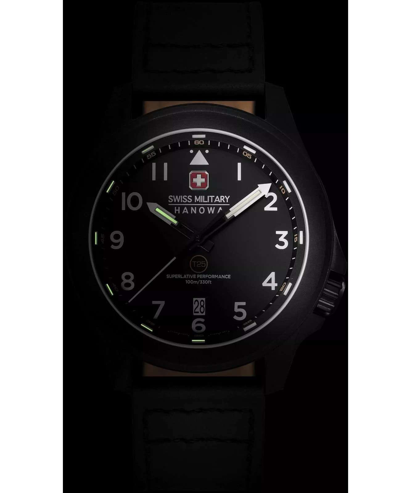 Мужские кварцевые часы Swiss Military Hanowa — это прочный и стильный аксессуар, вдохновлённый классическими полевыми моделями. Корпус диаметром 42 мм выполнен из нержавеющей стали с PVD-покрытиемPVDУльтратонкое покрытие наносится в технике вакуумного напыления, сочетает в себе нитрид титана особой прочности со слоем золота или оксида хрома. Несёт в себе декоративную или защитную функцию.. Циферблат чёрного цвета оформлен индексами и стрелками. Циферблат защищён сапфировым стекломСапфировое стеклоПрочный и надёжный материал из кристалла сапфира синтетического происхождения, характеризующийся особой твёрдостью и устойчивостью к царапинам и повреждениям.. Механизм — швейцарское кварцевое движение Ronda 515 (Swiss Made). Часы оснащены чёрным кожаным ремешком с матовой текстурой на классической пряжке. Водонепроницаемость 100 м позволяет использовать часы для плавания и повседневного ношения. Идеальный выбор для тех, кто ценит швейцарское качество и надёжность.