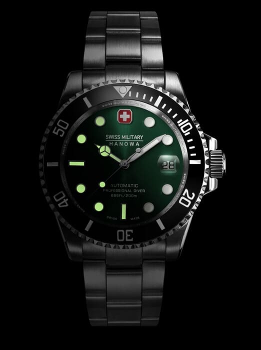 Мужские швейцарские часы Swiss Military Sealord SMWGL0006302 – это великолепные, стильные автоматические часы швейцарского производства, которые идеально подходят для дайвинга. Корпус из нержавеющей стали диаметром 41 мм сбалансирован и элегантен. Сапфировое стеклоСапфировое стеклоПрочный и надёжный материал из кристалла сапфира синтетического происхождения, характеризующийся особой твёрдостью и устойчивостью к царапинам и повреждениям. с антибликовым покрытием защищает циферблат от царапин и обеспечивает отличную читаемость при любом освещении. Браслет из нержавеющей стали с раскладной застёжкойРаскладная застёжкаТакой тип застёжки используется только на браслетах из металла. Она никогда не раскрывается полностью, происходит разделение на 2 и более частей. Раскладывающая застёжка снизит вероятность потери часов к минимуму. идеально дополняют дизайн часов, обеспечивая комфортное ношение. Люминесцентное покрытиеЛюминесцентное покрытиеПозволяет считывать показания времени в темноте. Производители наносят на стрелки, часовые индексы, безель или поверхность циферблата светонакопительный состав, дающий холодное свечение. стрелок и меток позволит вам следить за временем даже в полной темноте. Вращающийся керамический безельБезельВнешний ободок, закрепляющий стекло. В спортивных часах так называется поворотное кольцо с делениями на циферблате, выполняет роль таймера – замеряет отрезки времени на шкале. Неподвижный безель – элемент декора. Однонаправленно вращающийся безель на дайверских часах позволяет фиксировать моменты погружения и выныривания на поверхность.. Индикатор даты в положении «3 часа». Водонепроницаемость до 200 метров идеально подходят для дайвинга. Автоматический швейцарский механизм Soprod P024, который основан на знаменитом механизме ETA 2824.