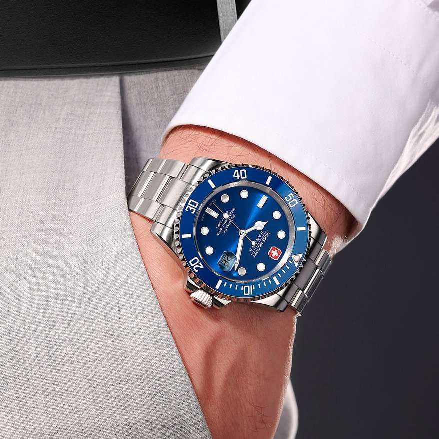 Мужские швейцарские часы Swiss Military Sealord SMWGL0006304 – это элегантные часы, сочетающие в себе классический дизайн и современную функциональность. Корпус из нержавеющей стали диаметром 41 мм сбалансирован и элегантен. Сапфировое стеклоСапфировое стеклоПрочный и надёжный материал из кристалла сапфира синтетического происхождения, характеризующийся особой твёрдостью и устойчивостью к царапинам и повреждениям. с антибликовым покрытием защищает циферблат от царапин и обеспечивает отличную читаемость при любом освещении. Браслет из нержавеющей стали с раскладной застёжкойРаскладная застёжкаТакой тип застёжки используется только на браслетах из металла. Она никогда не раскрывается полностью, происходит разделение на 2 и более частей. Раскладывающая застёжка снизит вероятность потери часов к минимуму. идеально дополняют дизайн часов, обеспечивая комфортное ношение. Люминесцентное покрытиеЛюминесцентное покрытиеПозволяет считывать показания времени в темноте. Производители наносят на стрелки, часовые индексы, безель или поверхность циферблата светонакопительный состав, дающий холодное свечение. стрелок и меток позволит вам следить за временем даже в полной темноте. Вращающийся керамический безельБезельВнешний ободок, закрепляющий стекло. В спортивных часах так называется поворотное кольцо с делениями на циферблате, выполняет роль таймера – замеряет отрезки времени на шкале. Неподвижный безель – элемент декора. Однонаправленно вращающийся безель на дайверских часах позволяет фиксировать моменты погружения и выныривания на поверхность.. Индикатор даты в положении «3 часа». Водонепроницаемость до 200 метров идеально подходят для дайвинга. Автоматический швейцарский механизм Soprod P024, который основан на знаменитом механизме ETA 2824. Эти профессиональные часы для дайвинга швейцарского производства созданы для преодоления трудностей — будь то под водой или в городских джунглях. Будь то деловая встреча, прогулка или спортивные соревнования — Swiss Military Hanowa Sealord Automatic станут идеальным спутником для мужчин