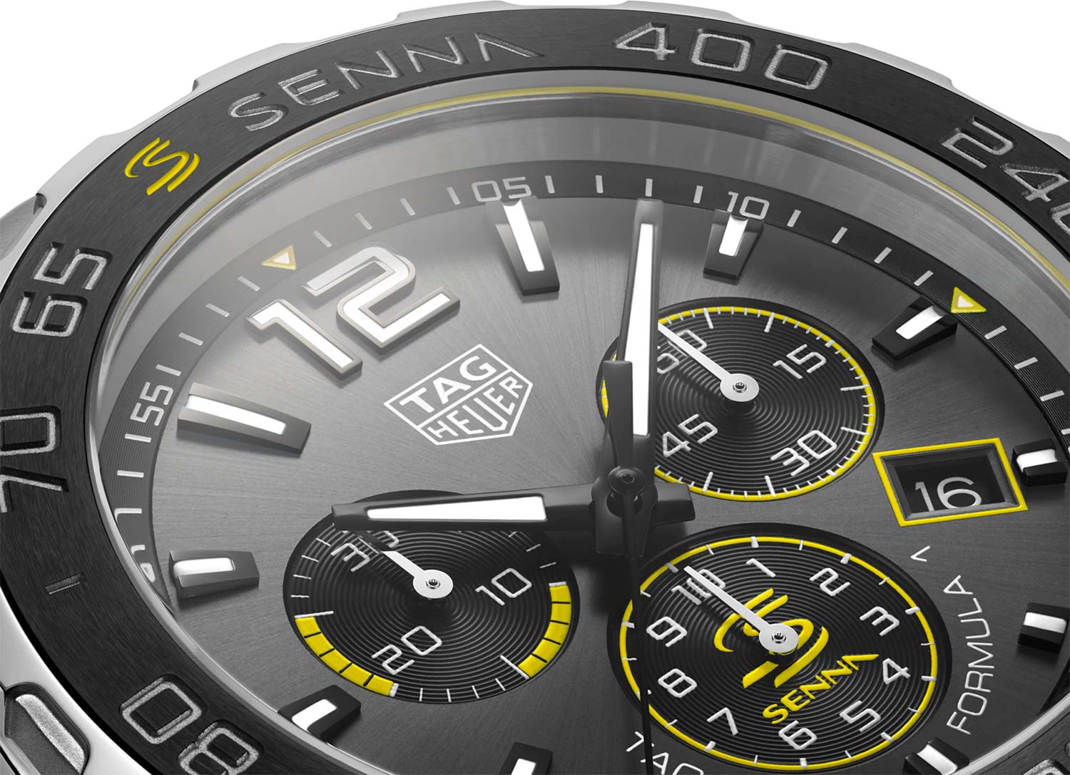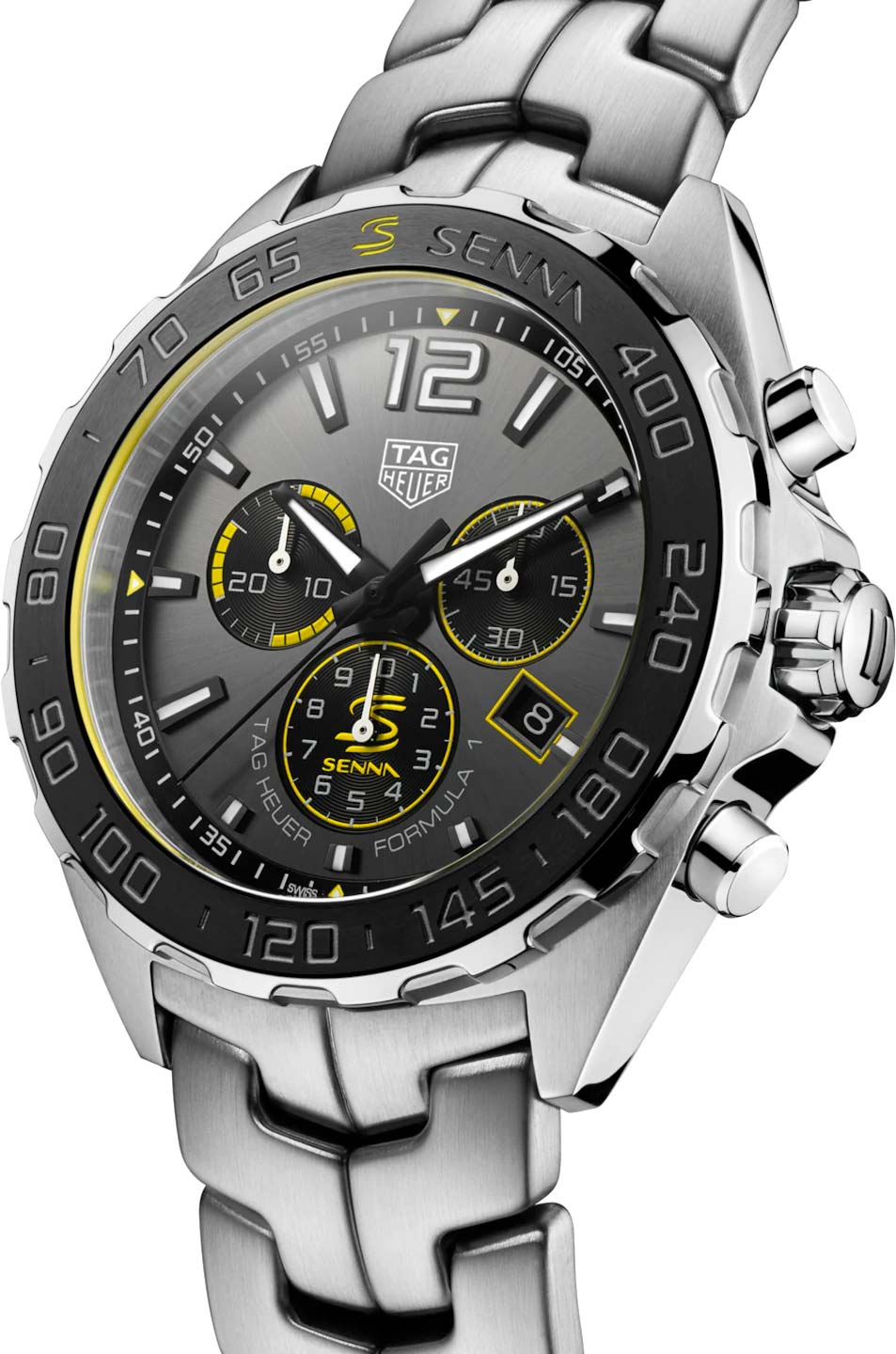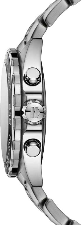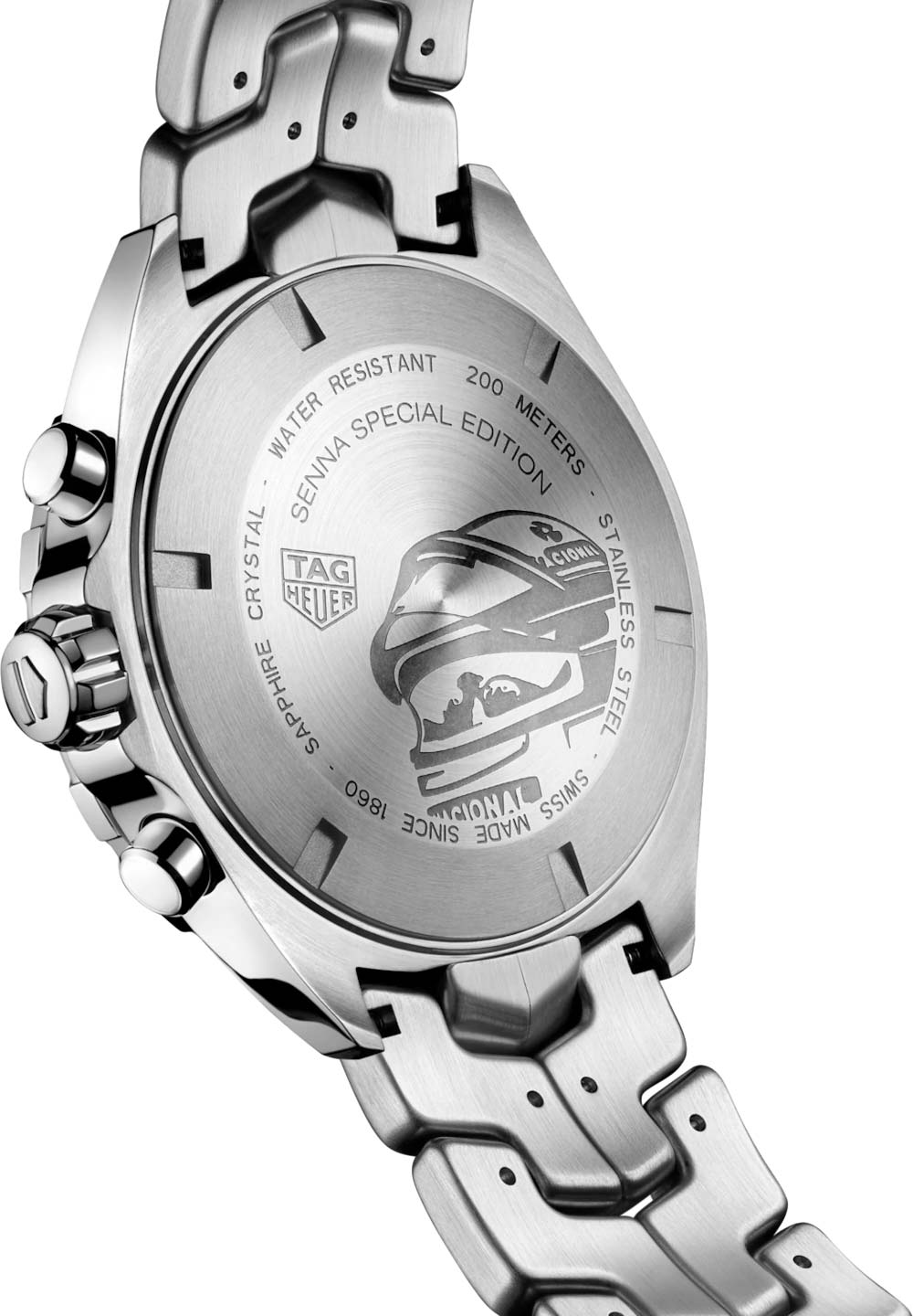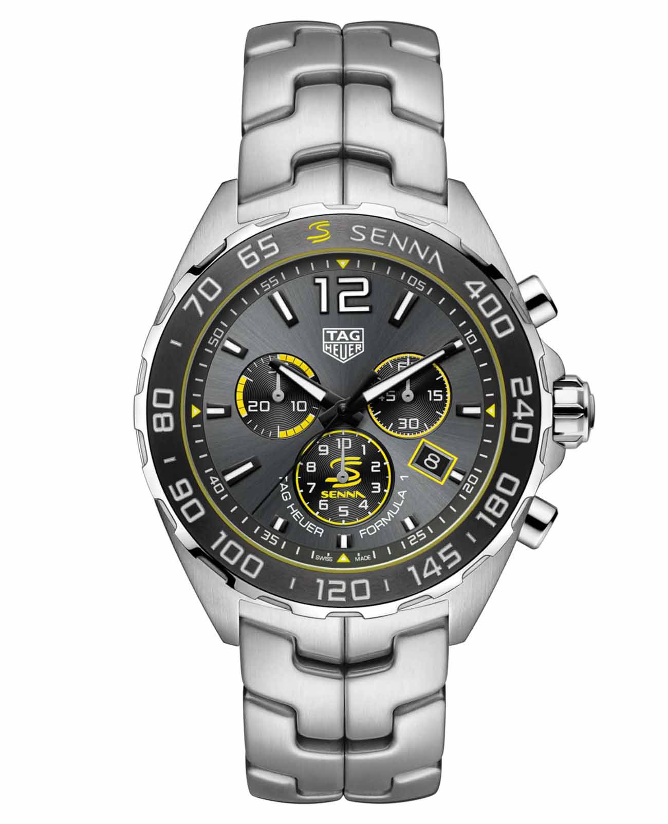 Кварцевый хронограф TAG Heuer Formula 1 Senna Special Edition CAZ101AF.BA0637 - это еще одно посвящение известному гонщику Формулы-1 Айртону Сенне. Гравировка в виде спортивного шлема нанесена на заднюю крышку корпуса, а фамилия гонщика украшает керамическую вставку безеля и циферблат модели. Серый циферблат украшен узором "солнечные лучи", стрелки и часовые метки имеют Super-LumiNova® нанесение. Кварцевый механизм работает от батареек. Застежка с фирменной гравировкой TAG Heuer выполнена из нержавеющей стали. Антибликовое сапфировое стекло. Стальной браслет выполнен из S-образных звеньев, именно такой Link-браслет Сенна находил наиболее удобным