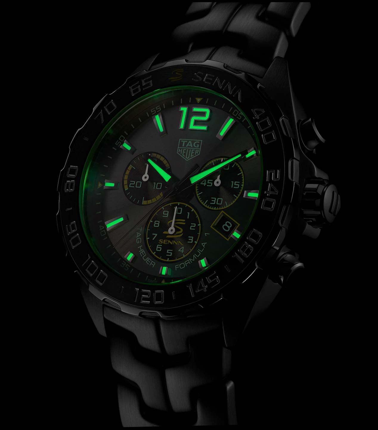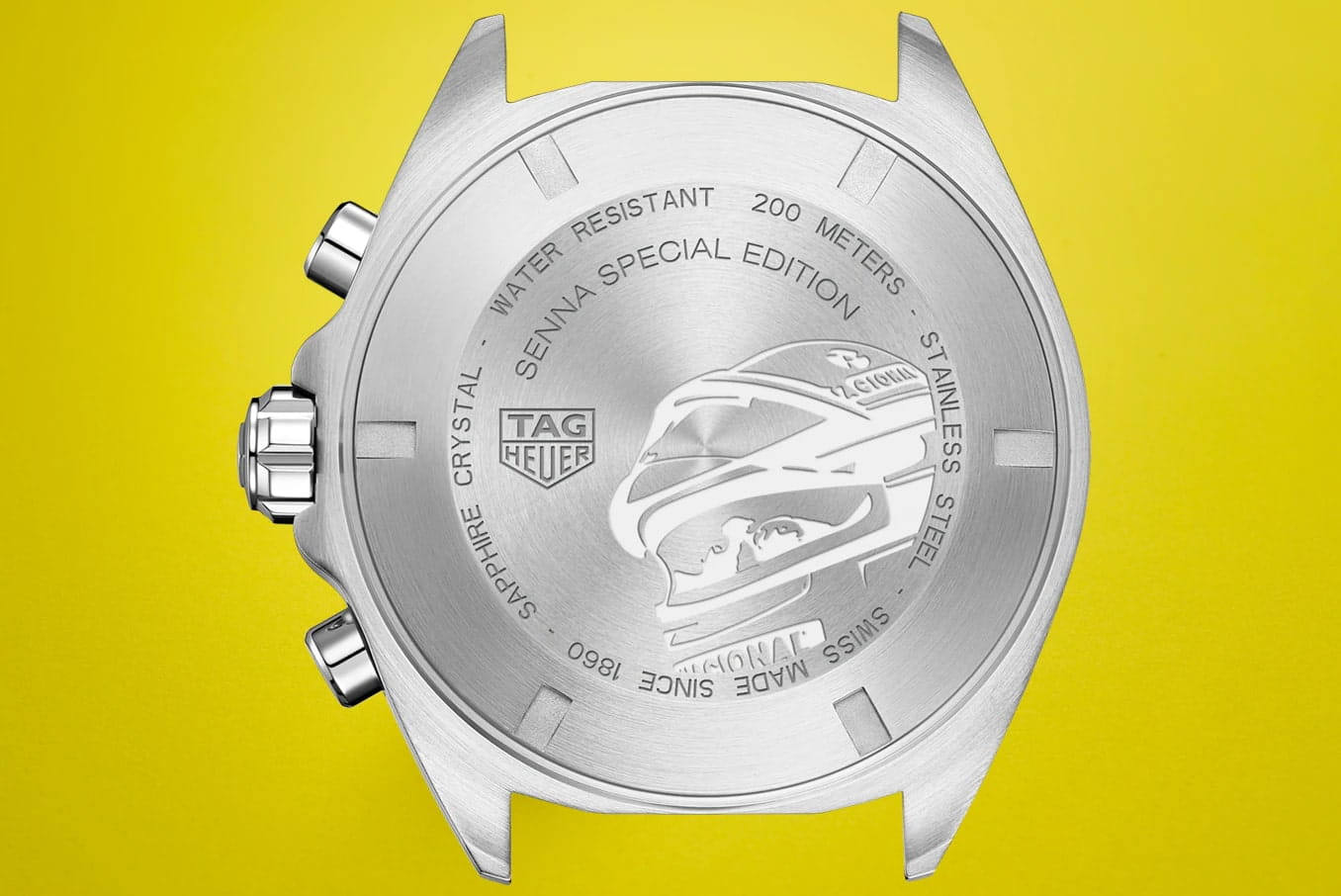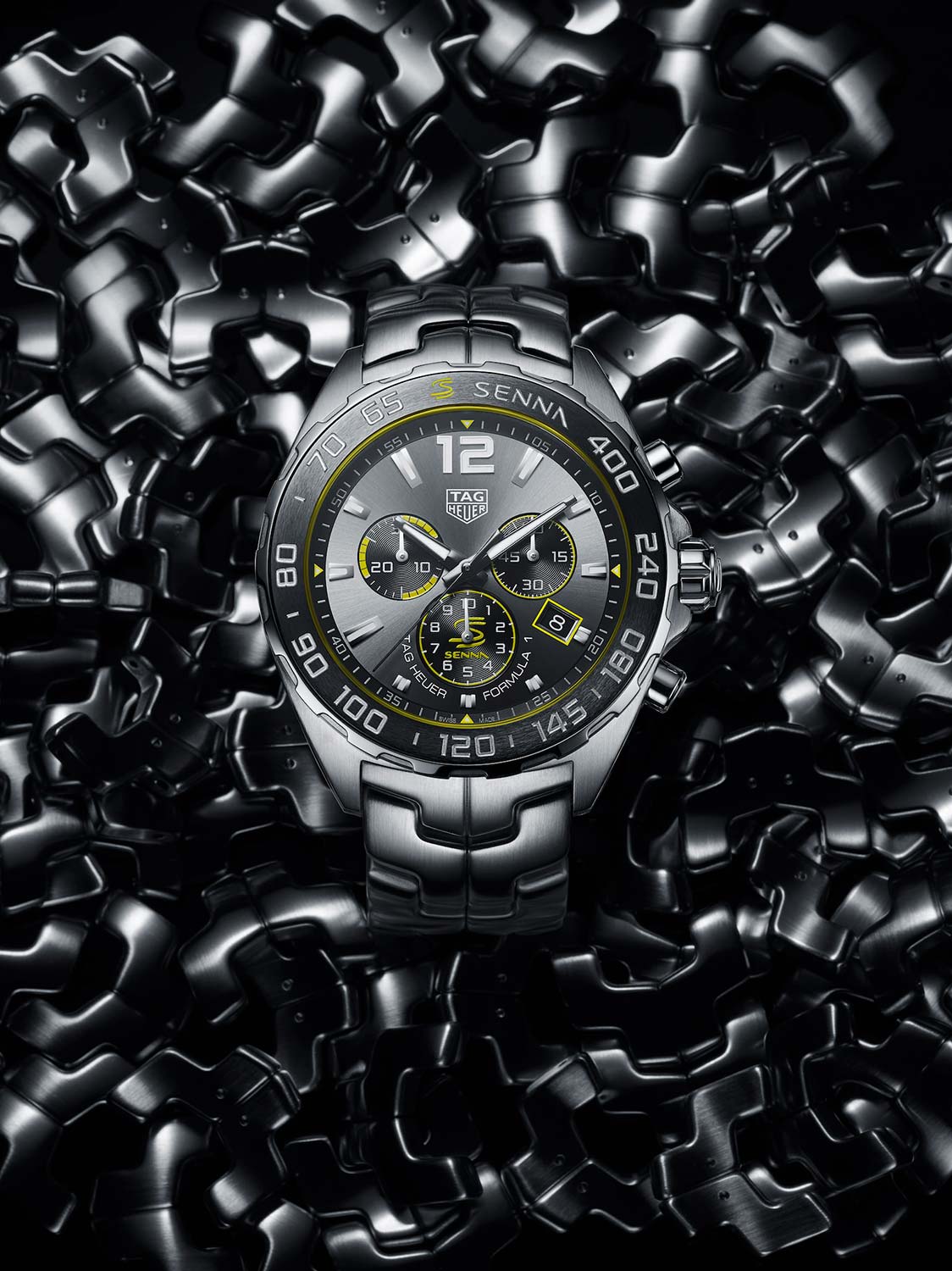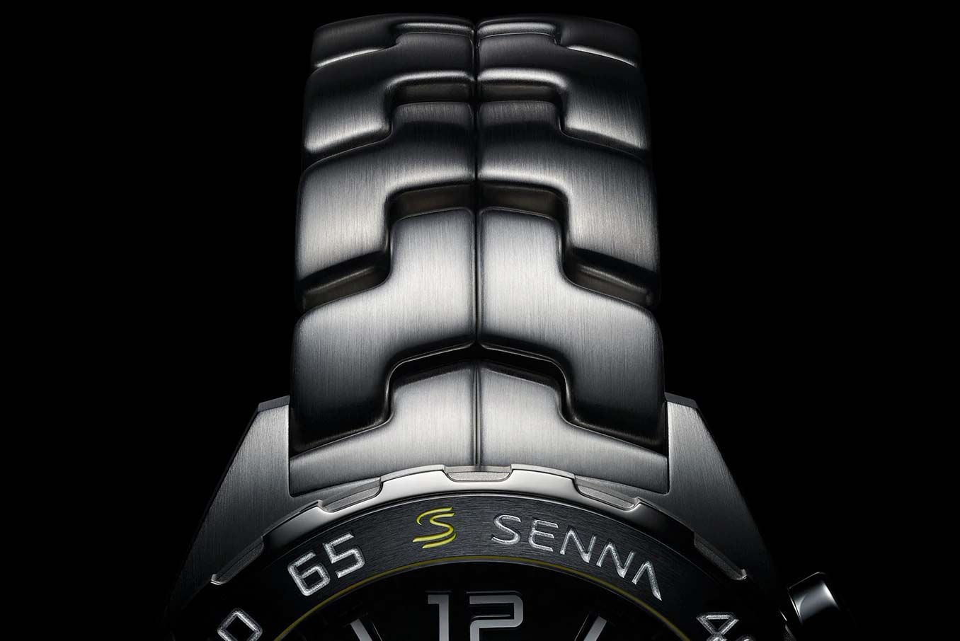 Кварцевый хронограф TAG Heuer Formula 1 Senna Special Edition CAZ101AF.BA0637 - это еще одно посвящение известному гонщику Формулы-1 Айртону Сенне. Гравировка в виде спортивного шлема нанесена на заднюю крышку корпуса, а фамилия гонщика украшает керамическую вставку безеля и циферблат модели. Серый циферблат украшен узором "солнечные лучи", стрелки и часовые метки имеют Super-LumiNova® нанесение. Кварцевый механизм работает от батареек. Застежка с фирменной гравировкой TAG Heuer выполнена из нержавеющей стали. Антибликовое сапфировое стекло. Стальной браслет выполнен из S-образных звеньев, именно такой Link-браслет Сенна находил наиболее удобным