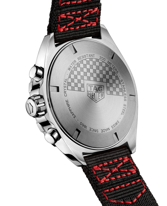 Выполненный в гоночной тематике хронограф с кварцевым механизмом, черным опаловым циферблатом, белым фланцем и белыми опаловыми вспомогательными циферблатами в положениях «3 часа»,«6 часов» и «9 часов». Стрелки вспомогательного циферблата огненно-красного цвета с эффектным покрытием из черного золота. Серебристые часовые индексы, часовые и минутные стрелки с белым люминесцентным покрытием Super-LumiNova® для превосходной читаемости показаний при слабом освещении.