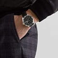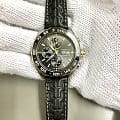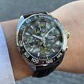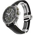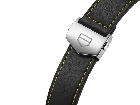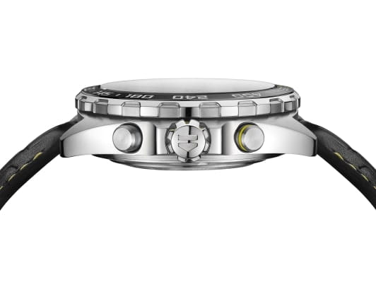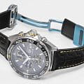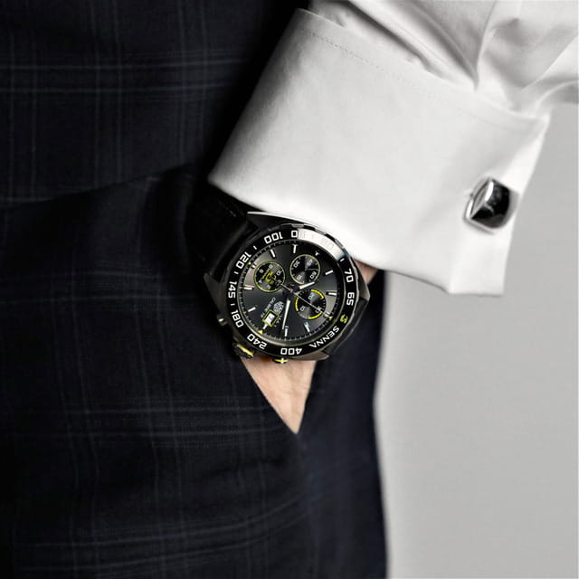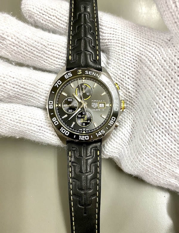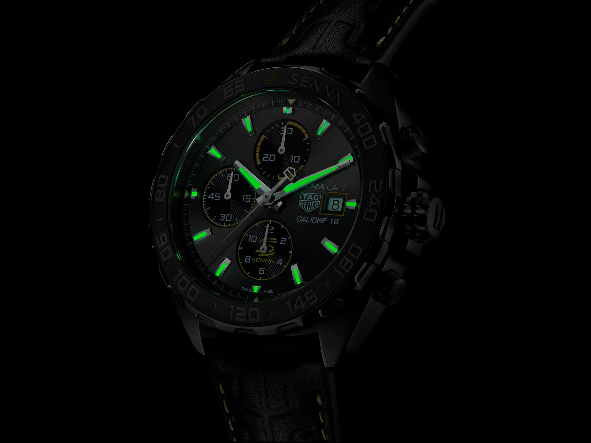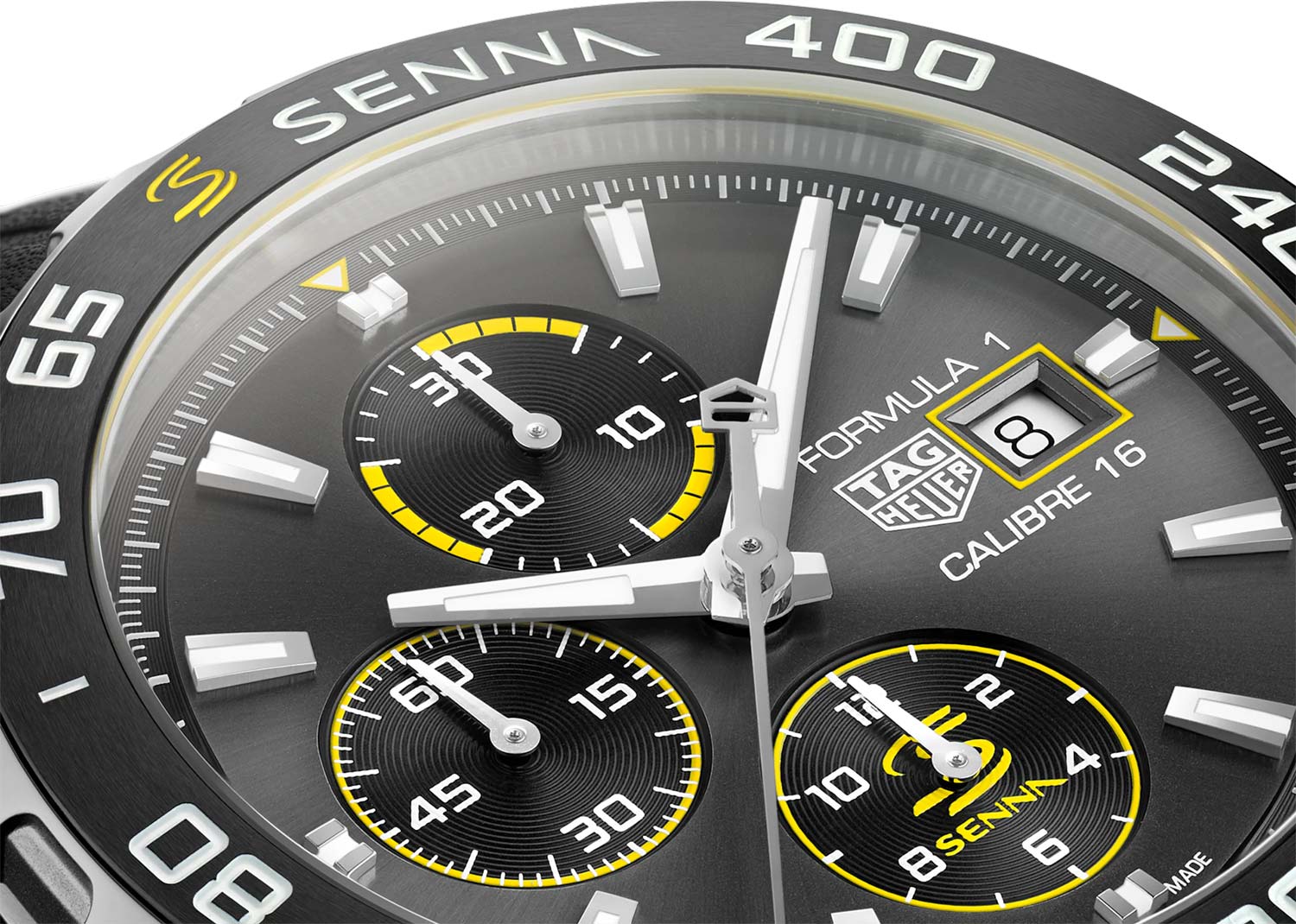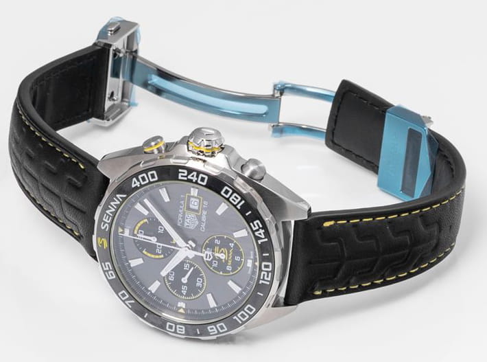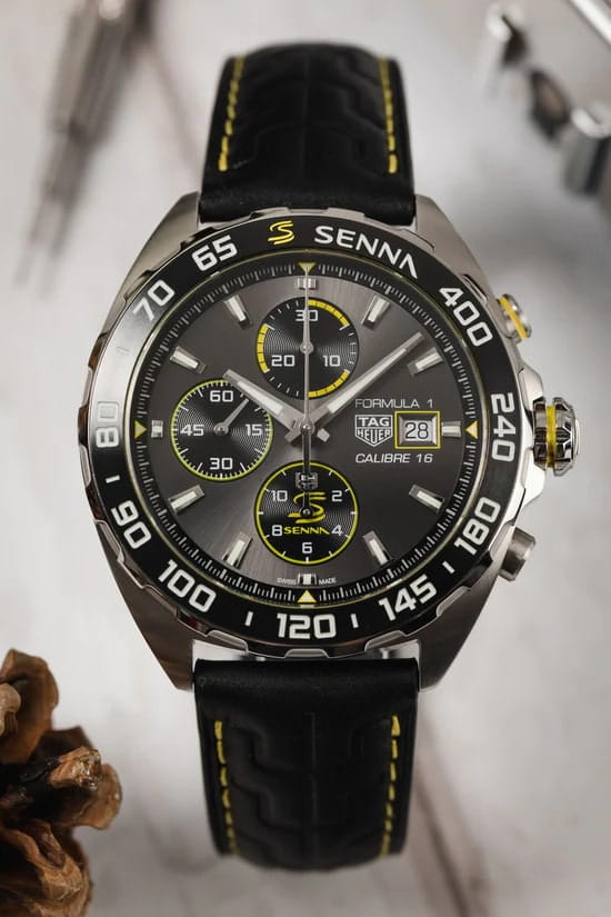 Швейцарские механические наручные часы-хронографХронографФункция позволяет измерять отрезки времени с особой точностью: часы, минуты, секунды. Верным признаком хронографа является наличие на циферблате 3 дополнительных окошек-счётчиков. TAG Heuer Formula 1 Senna Special Edition CAZ201B.FC6487 с секундомеромСекундомерСекундоме́р — прибор, способный измерять интервалы времени с точностью до долей секунды. и тахиметромТахиметрРазмеченная шкала, располагается на ободке или безеле часов. Тахиметр позволяет рассчитать скорость на определённом участке пути, расстояние измеряется в километрах или милях., механический механизм (автоматический калибр) с высокой точностью. Сапфировое стеклоСапфировое стеклоПрочный и надёжный материал из кристалла сапфира синтетического происхождения, характеризующийся особой твёрдостью и устойчивостью к царапинам и повреждениям. устойчивое к появлению царапин, обладающее высокой прозрачностью. Класс водозащиты: 200 метров, позволит плавать, нырять и заниматься другими водными видами спорта. Корпус часов изготовлен из стали. Кожаный ремешок с раскладной застёжкойРаскладная застёжкаТакой тип застёжки используется только на браслетах из металла. Она никогда не раскрывается полностью, происходит разделение на 2 и более частей. Раскладывающая застёжка снизит вероятность потери часов к минимуму.. Кнопки двойной блокировки и система увеличения длины. Окошко даты находится в положении 3 часа. Счетчики на 1/4 секунды, 30-минутный и 12-часовой. В механизме 25 камней, частота 28800 полуколебаний в час. Запас хода около 42 часов. Керамический безельБезельВнешний ободок, закрепляющий стекло. В спортивных часах так называется поворотное кольцо с делениями на циферблате, выполняет роль таймера – замеряет отрезки времени на шкале. Неподвижный безель – элемент декора. Однонаправленно вращающийся безель на дайверских часах позволяет фиксировать моменты погружения и выныривания на поверхность. вращается в одном направлении. Завинчивающаяся заводная головка с защитой. Завинчивающаяся задняя крышка украшена изображением гоночного шлема. Накладные индексы с родиевым покрытием. Стрелки и метки с люминесцентным покрытиемЛюминесцентное покрытиеПозволяет считывать показания времени в темноте. Производители наносят на стрелки, часовые индексы, безель или поверхность циферблата светонакопительный состав, дающий холодное свечение..