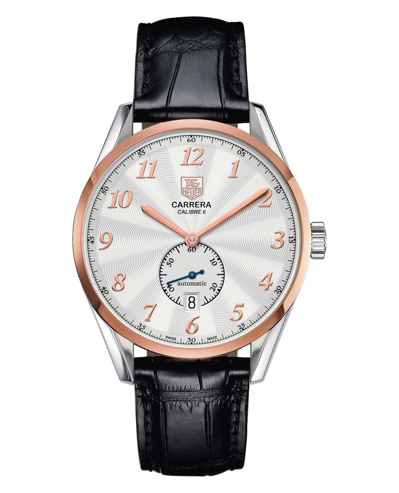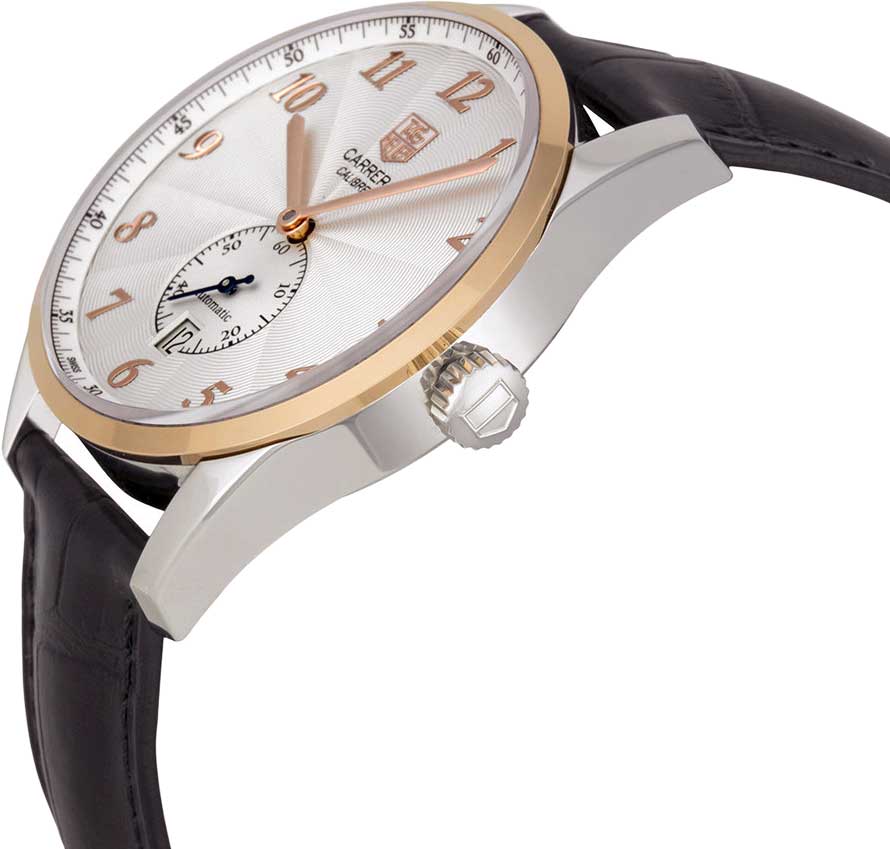 Часы с элементами из розового золота. Предназначены для мужчин, живущих в ритме динамичной городской жизни. TAG Heuer Carrera WAS2151.FC6180, механический механизм (автоматический калибр) с высокой точностью. Сапфировое стеклоСапфировое стеклоПрочный и надёжный материал из кристалла сапфира синтетического происхождения, характеризующийся особой твёрдостью и устойчивостью к царапинам и повреждениям. устойчивое к появлению царапин, обладающее высокой прозрачностью. Класс водозащиты: 100 метров, позволит плавать, нырять и заниматься другими водными видами спорта. Раскладная застёжкаРаскладная застёжкаТакой тип застёжки используется только на браслетах из металла. Она никогда не раскрывается полностью, происходит разделение на 2 и более частей. Раскладывающая застёжка снизит вероятность потери часов к минимуму.. Корпус часов изготовлен из стали и безеляБезельВнешний ободок, закрепляющий стекло. В спортивных часах так называется поворотное кольцо с делениями на циферблате, выполняет роль таймера – замеряет отрезки времени на шкале. Неподвижный безель – элемент декора. Однонаправленно вращающийся безель на дайверских часах позволяет фиксировать моменты погружения и выныривания на поверхность. из 18-ти каратного золота.