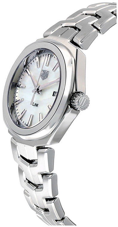 Женские швейцарские часы TAG Heuer Link WBC1310.BA0600, кварцевый механизм с высокой точностью. Сапфировое стеклоСапфировое стеклоПрочный и надёжный материал из кристалла сапфира синтетического происхождения, характеризующийся особой твёрдостью и устойчивостью к царапинам и повреждениям. устойчивое к появлению царапин, обладающее высокой прозрачностью, с антибликовым покрытием. Класс водозащиты: 100 метров, позволит плавать, нырять и заниматься другими водными видами спорта. Перламутровый циферблат переливается различными оттенками синего в зависимости от положения запястья. Серебристые часовые метки, стрелки и культовый логотип TAG HEUER в положении «12 часов» образуют выразительную игру контрастов. Стальной браслет на раскладной застёжкеРаскладная застёжкаТакой тип застёжки используется только на браслетах из металла. Она никогда не раскрывается полностью, происходит разделение на 2 и более частей. Раскладывающая застёжка снизит вероятность потери часов к минимуму.. Завинчивающаяся задняя крышка.