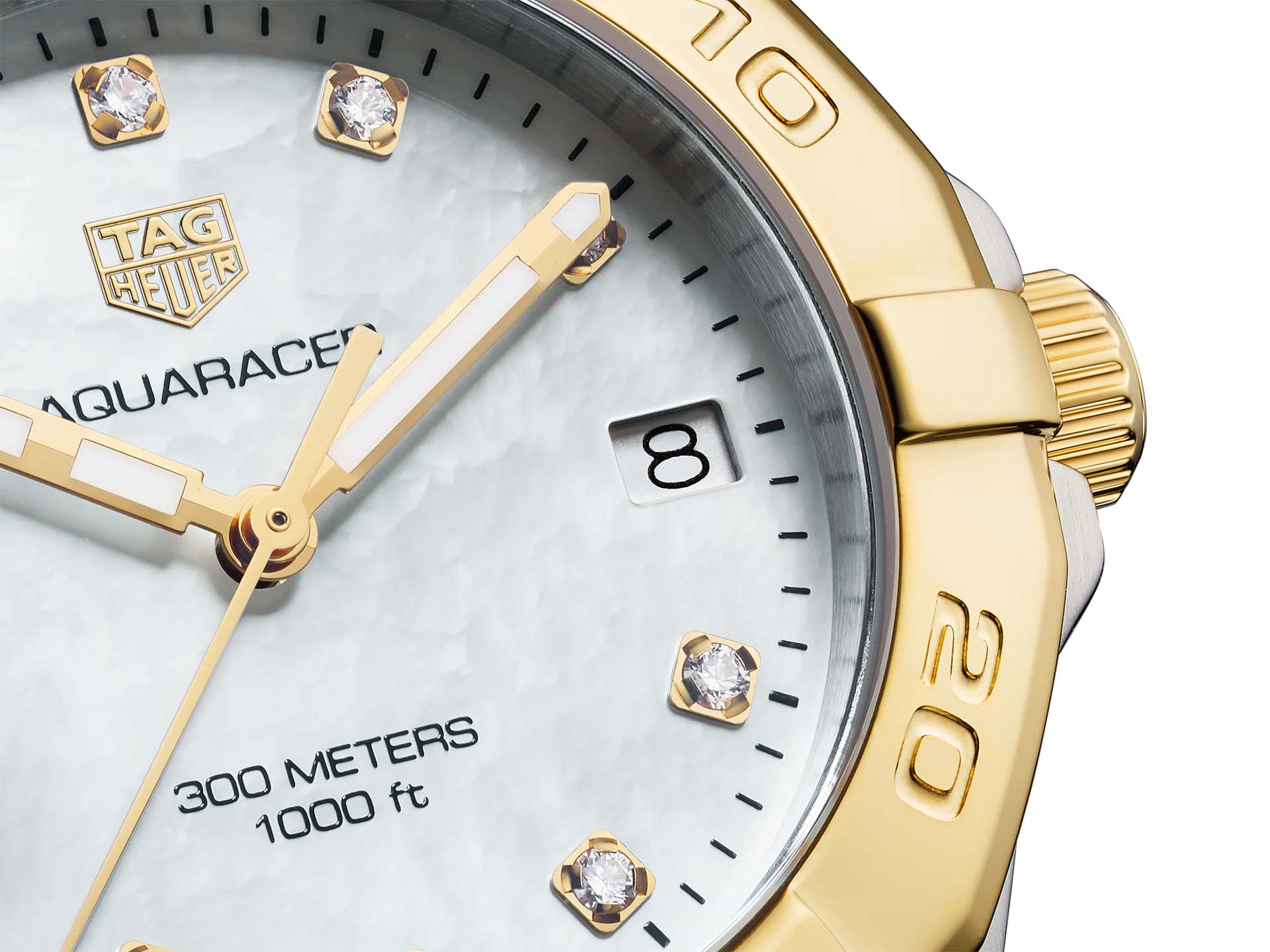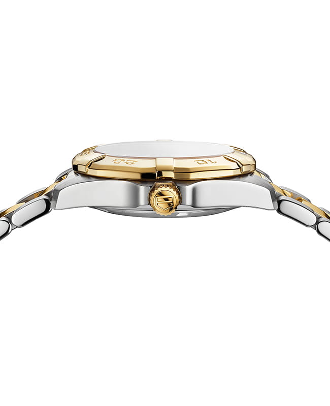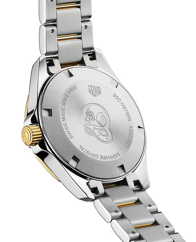 Женские швейцарские часы TAG Heuer Aquaracer WBD1322.BB0320, кварцевый механизм с высокой точностью. Сапфировое стеклоСапфировое стеклоПрочный и надёжный материал из кристалла сапфира синтетического происхождения, характеризующийся особой твёрдостью и устойчивостью к царапинам и повреждениям. устойчивое к появлению царапин, обладающее высокой прозрачностью. Класс водозащиты: 300 метров, позволит плавать, нырять и заниматься другими водными видами спорта. Корпус часов изготовлен из стали. Стальной браслет на раскладной застёжкеРаскладная застёжкаТакой тип застёжки используется только на браслетах из металла. Она никогда не раскрывается полностью, происходит разделение на 2 и более частей. Раскладывающая застёжка снизит вероятность потери часов к минимуму.. Рифленый вращающийся 12-гранный безельБезельВнешний ободок, закрепляющий стекло. В спортивных часах так называется поворотное кольцо с делениями на циферблате, выполняет роль таймера – замеряет отрезки времени на шкале. Неподвижный безель – элемент декора. Однонаправленно вращающийся безель на дайверских часах позволяет фиксировать моменты погружения и выныривания на поверхность. с минутной шкалой выполнен из 18-каратного золота18-каратное золотоОбозначение по каратной системе пробирования, оно показывает, сколько драгоценного металла содержится в изделии. 18 карат - в составе 75% чистого золота, соответствует 750 пробе.