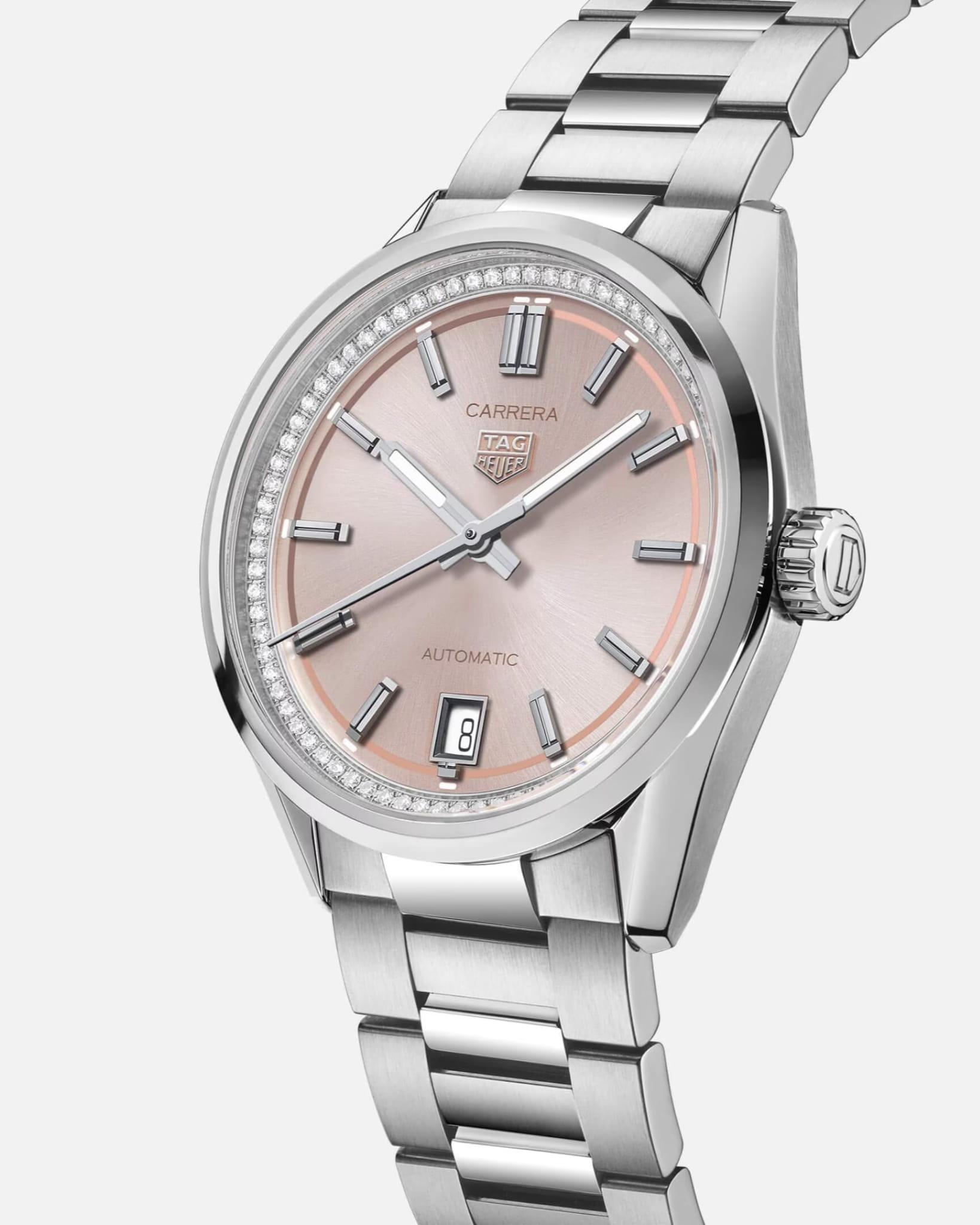 Утончённые часы TAG Heuer Carrera Date WBN231A.BA0001 созданы для стильных и смелых женщин. Механический механизм (автоматический калибр) с высокой точностью производится целиком в стенах компании. Сапфировое стеклоСапфировое стеклоПрочный и надёжный материал из кристалла сапфира синтетического происхождения, характеризующийся особой твёрдостью и устойчивостью к царапинам и повреждениям. устойчивое к появлению царапин, обладающее высокой прозрачностью. На стрелки и метки нанесено люминесцентное покрытиеЛюминесцентное покрытиеПозволяет считывать показания времени в темноте. Производители наносят на стрелки, часовые индексы, безель или поверхность циферблата светонакопительный состав, дающий холодное свечение.. Класс водозащиты: 50 метров, позволит защитить корпус от случайных брызг или капель дождя. Браслет с раскладной застёжкойРаскладная застёжкаТакой тип застёжки используется только на браслетах из металла. Она никогда не раскрывается полностью, происходит разделение на 2 и более частей. Раскладывающая застёжка снизит вероятность потери часов к минимуму.. Апертура даты находится на отметке 6 часов. БезельБезельВнешний ободок, закрепляющий стекло. В спортивных часах так называется поворотное кольцо с делениями на циферблате, выполняет роль таймера – замеряет отрезки времени на шкале. Неподвижный безель – элемент декора. Однонаправленно вращающийся безель на дайверских часах позволяет фиксировать моменты погружения и выныривания на поверхность. инкрустирован 76 бриллиантами.