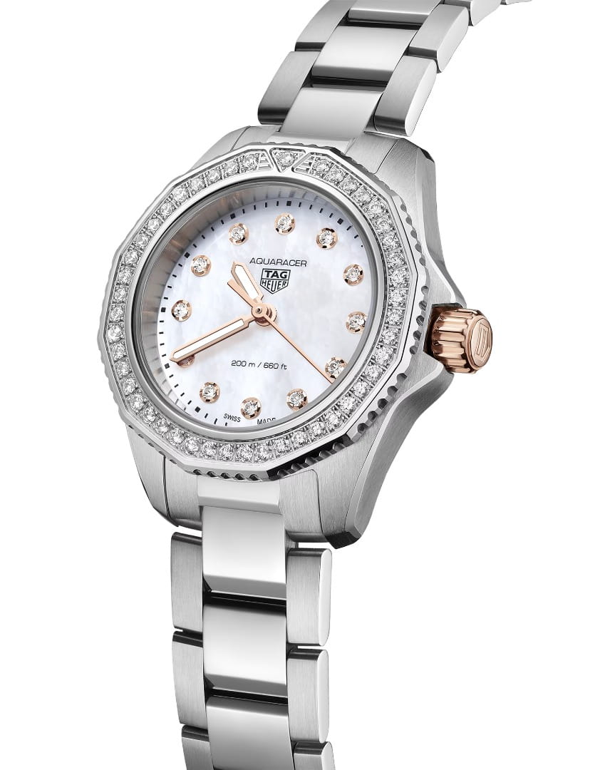 Женские швейцарские наручные кварцевые часы TAG Heuer Aquaracer Professional WBP1451.BA0622. Сапфировое стеклоСапфировое стеклоПрочный и надёжный материал из кристалла сапфира синтетического происхождения, характеризующийся особой твёрдостью и устойчивостью к царапинам и повреждениям. устойчивое к появлению царапин, обладающее высокой прозрачностью. Стрелки и метки с люминесцентным покрытиемЛюминесцентное покрытиеПозволяет считывать показания времени в темноте. Производители наносят на стрелки, часовые индексы, безель или поверхность циферблата светонакопительный состав, дающий холодное свечение.. Класс водозащиты: 200 метров, позволит плавать, нырять и заниматься другими водными видами спорта. Корпус часов изготовлен из нержавеющей стали. Браслет с раскладной застёжкойРаскладная застёжкаТакой тип застёжки используется только на браслетах из металла. Она никогда не раскрывается полностью, происходит разделение на 2 и более частей. Раскладывающая застёжка снизит вероятность потери часов к минимуму.. Вращающийся стальной безельБезельВнешний ободок, закрепляющий стекло. В спортивных часах так называется поворотное кольцо с делениями на циферблате, выполняет роль таймера – замеряет отрезки времени на шкале. Неподвижный безель – элемент декора. Однонаправленно вращающийся безель на дайверских часах позволяет фиксировать моменты погружения и выныривания на поверхность. и циферблат инкрустированы бриллиантами.