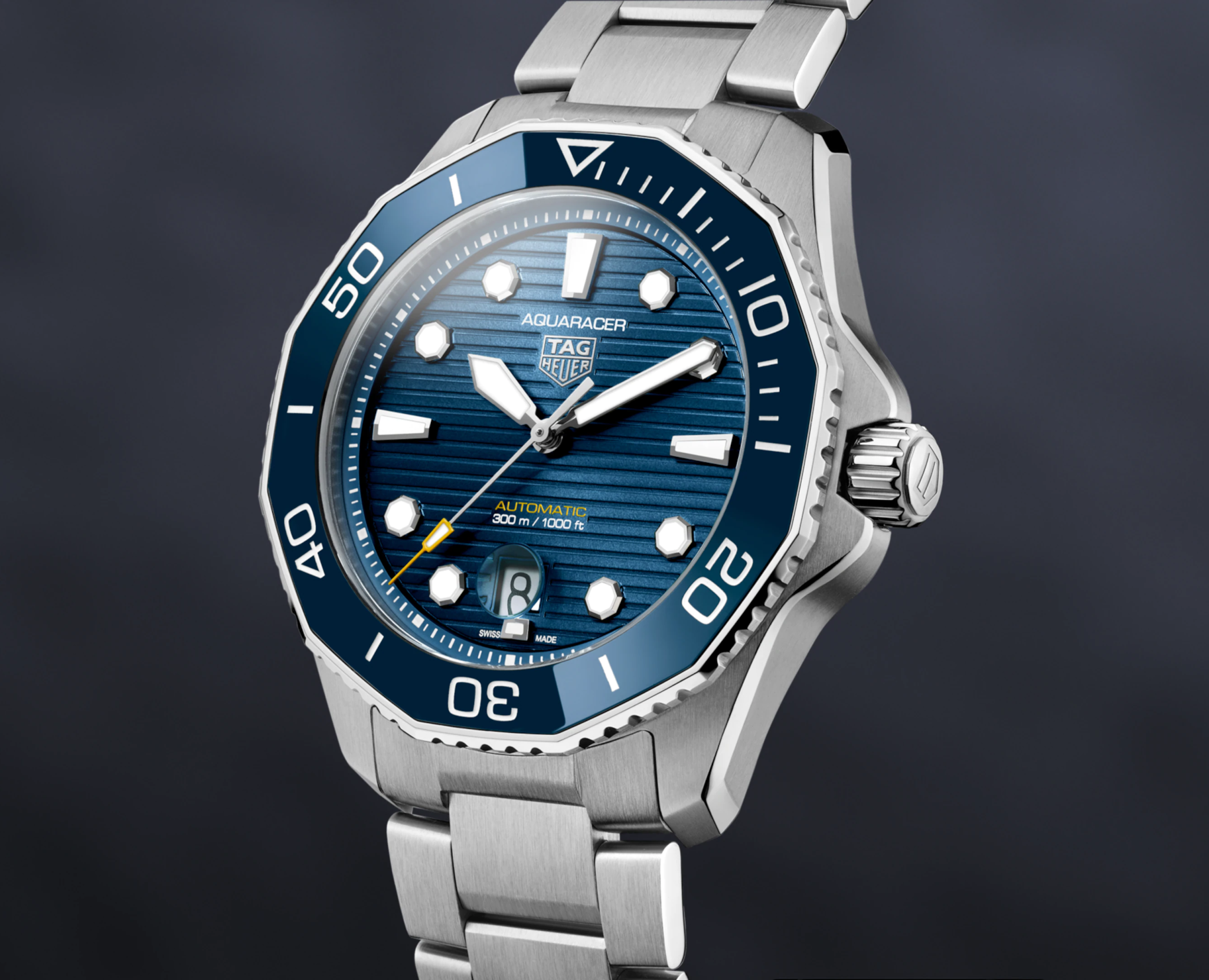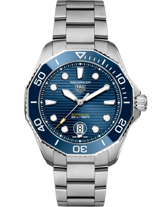 TAG Heuer Aquaracer Professional 300 WBP201B.BA0632 с синим матовым циферблатом в узоре «солнечные лучи», механический механизм (автоматический калибр) с высокой точностью. Сапфировое стекло устойчивое к появлению царапин, обладающее высокой прозрачностью. Класс водозащиты: 300 метров, позволит плавать, нырять и заниматься другими водными видами спорта. Корпус часов изготовлен из стали, серебристого цвета. Вращающийся в одном направлении ярко-синий керамический безель с 12 гранями и с 60-минутной шкалой измерения времени с момента погружения, соответствует корпусу и циферблату. Новый стальной корпус 43 мм сочетает в себе матовую и полированную поверхности, предлагая четкую геометрию и прочность в более тонком профиле для максимального комфорта. Устойчивый к давлению клиновидный стальной браслет с системой точной регулировки для серьезных дайверов фиксируется двумя предохранительными кнопками на застежке.