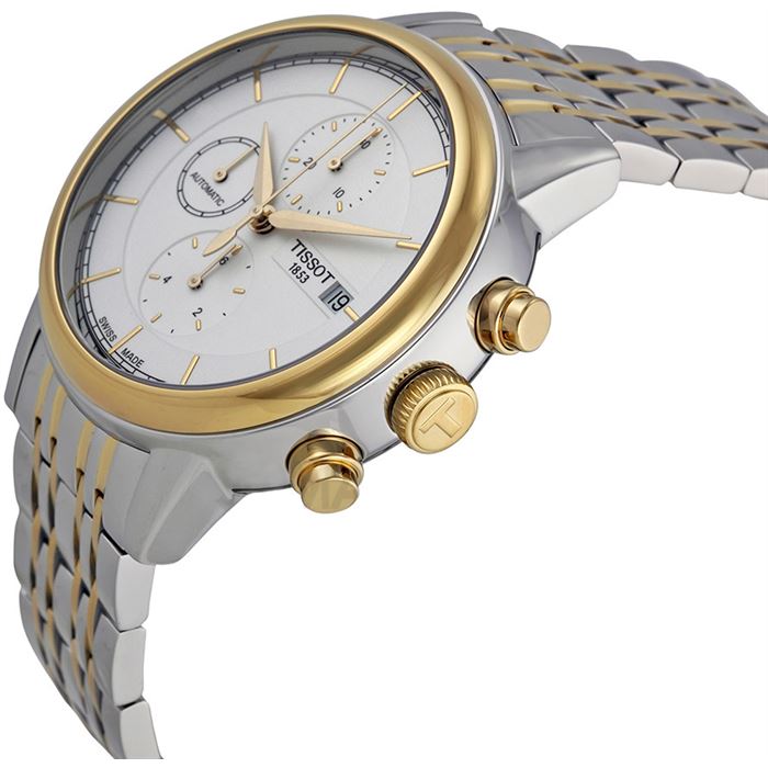 TISSOT T0854272201100 T-Classic Carson  - мужские механические наручные часы Корпус этих часов среднего размера (42,3 мм) и выполнен из нержавеющей стали L316 Модель TISSOT T0854272201100 T-Classic Carson имеет устойчивое к царапинам сапфировое стекло, браслет из нержавеющей стали, белый циферблат Калибр механизма: C01211 Класс водозащиты: 30 м / 3 АТМ (защита от брызг и случайных капель) Дополнительные функции и особенности: отображение числа , секундомер, хронограф, запас хода до 45 часов Полная заводская комплектация TISSOT: оригинальные часы, фирменная коробка, инструкция, сервисная книжка, роман о часовой фабрике, миникаталог, замшевый фирменный чехол черного цвета для хранения и/или переноски часов, кассовый и товарный чеки Международная гарантия 2 года Производство и сборка: Швейцария