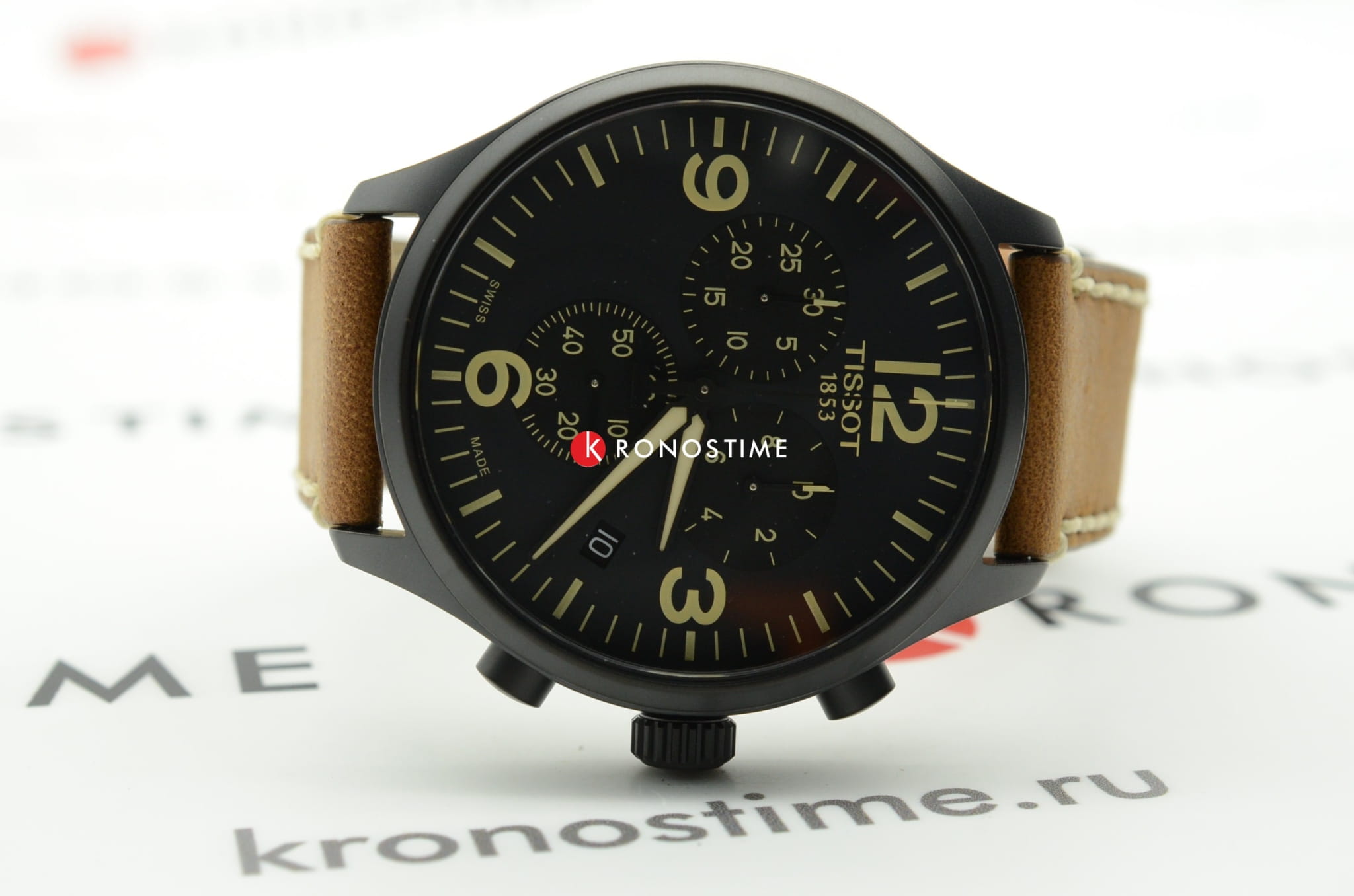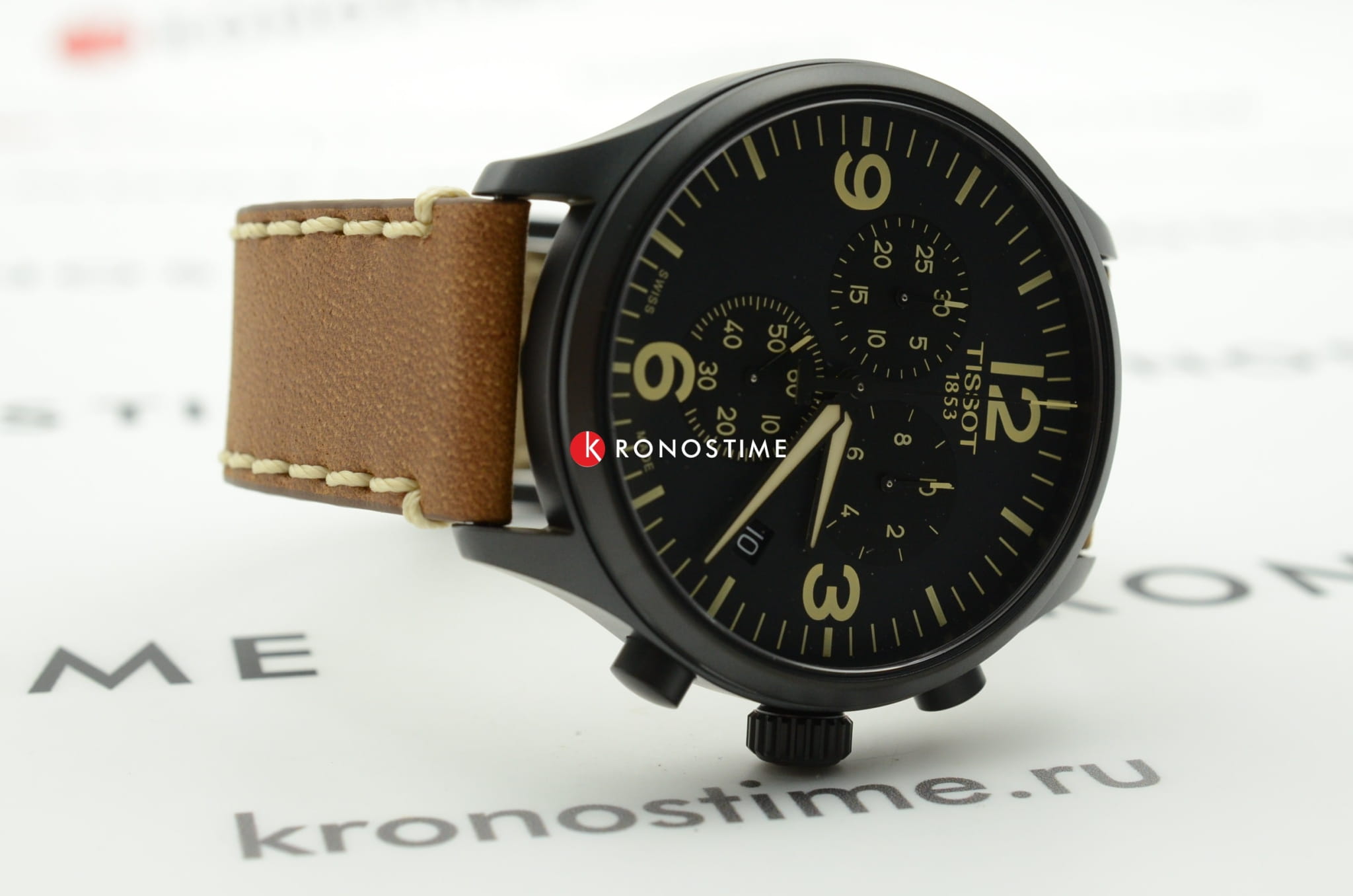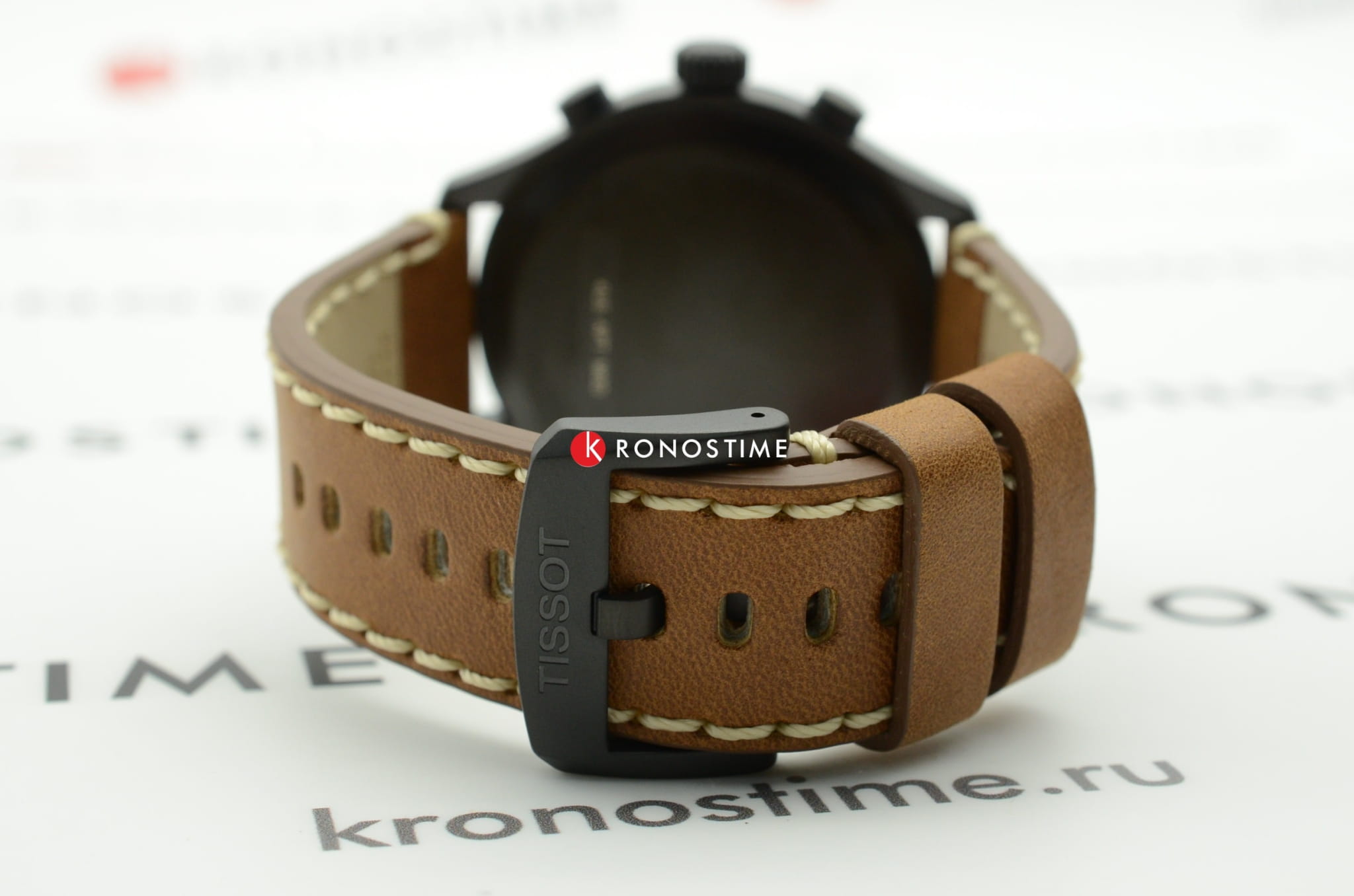 Дизайнеры делают ставку на оригинальный ремешок с характерной прострочкой, он сделан из натуральной кожи. Модель относится к числу самых больших хронографов среди всей продукции Tissot, диаметр их корпуса имеет внушительный размер - 45 мм. Кварцевый калибр ETA G10.212 с 4 камнями. Корпус из хирургической стали с чёрным PVD-покрытием. Хронограф, секундомер, окошко даты. Габариты: 45 x 45 x 11 мм.