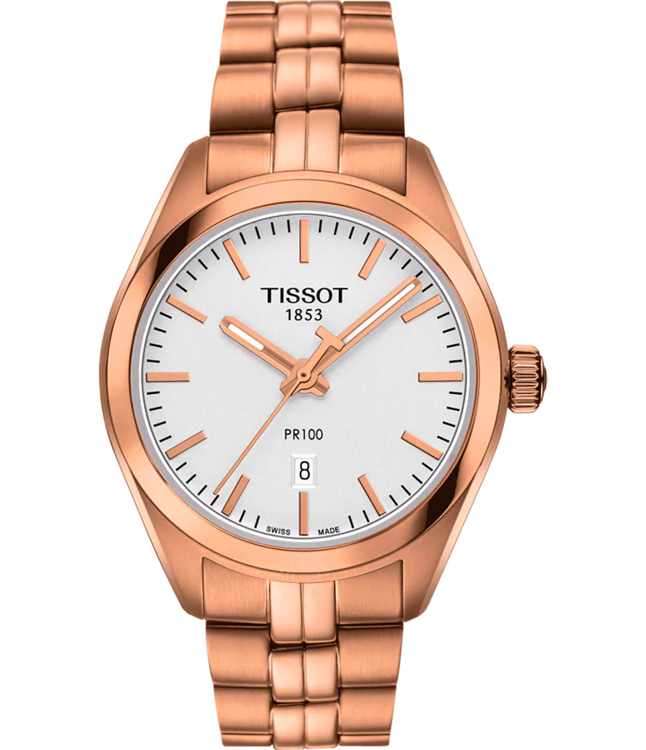 Часы являются воплощением традиций Tissot и элегантности, модель в цвете розового золота будет уместна на любом мероприятии. Такой оттенок образуется благодаря PVD-покрытиюPVDУльтратонкое покрытие наносится в технике вакуумного напыления, сочетает в себе нитрид титана особой прочности со слоем золота или оксида хрома. Несёт в себе декоративную или защитную функцию., устойчивому к царапинам и повреждениям. Кварцевый высокоточный калибр ETA F04.111. Сапфировое стекло. Люминесцентное покрытиеЛюминесцентное покрытиеПозволяет считывать показания времени в темноте. Производители наносят на стрелки, часовые индексы, безель или поверхность циферблата светонакопительный состав, дающий холодное свечение. стрелок. Водостойкость 100 метров. Застёжка бабочка с кнопками. Функционал: EOLEOLПредставляет собой систему, уведомляющую владельца часов о необходимости замены элемента питания. За 2 недели до полного разряда батарейки секундная стрелка перестаёт ходить чётко и начинает перепрыгивать на 3-4 деления., индикация даты. Габариты: 33 x 33 x 9 мм.
