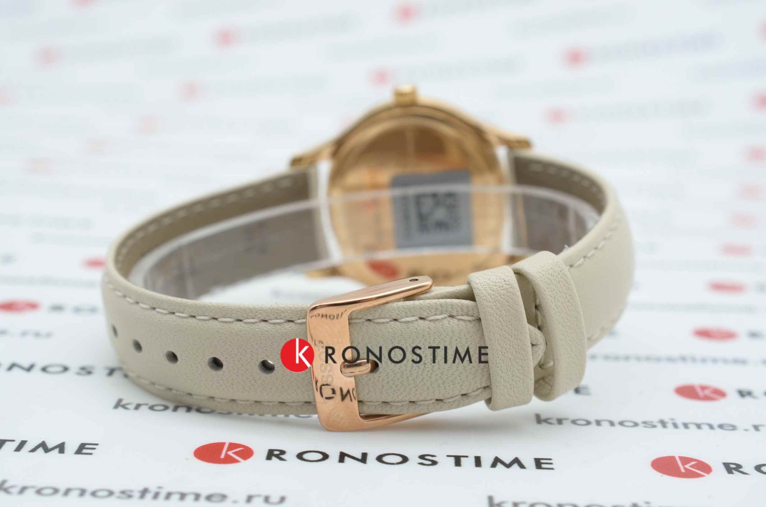 Минималистичный циферблат с PVD-покрытиемPVDУльтратонкое покрытие наносится в технике вакуумного напыления, сочетает в себе нитрид титана особой прочности со слоем золота или оксида хрома. Несёт в себе декоративную или защитную функцию. розового золота станет лучшим решением для дополнения классического или вечернего образа. Дизайнерская модель имеет ремешок из натуральной кожи кремового оттенка. Кварцевый механизм ETA 980.153 с высокой точностью хода. Надёжное сапфировое стекло. Функция EOLEOLПредставляет собой систему, уведомляющую владельца часов о необходимости замены элемента питания. За 2 недели до полного разряда батарейки секундная стрелка перестаёт ходить чётко и начинает перепрыгивать на 3-4 деления., отображение текущего числа.